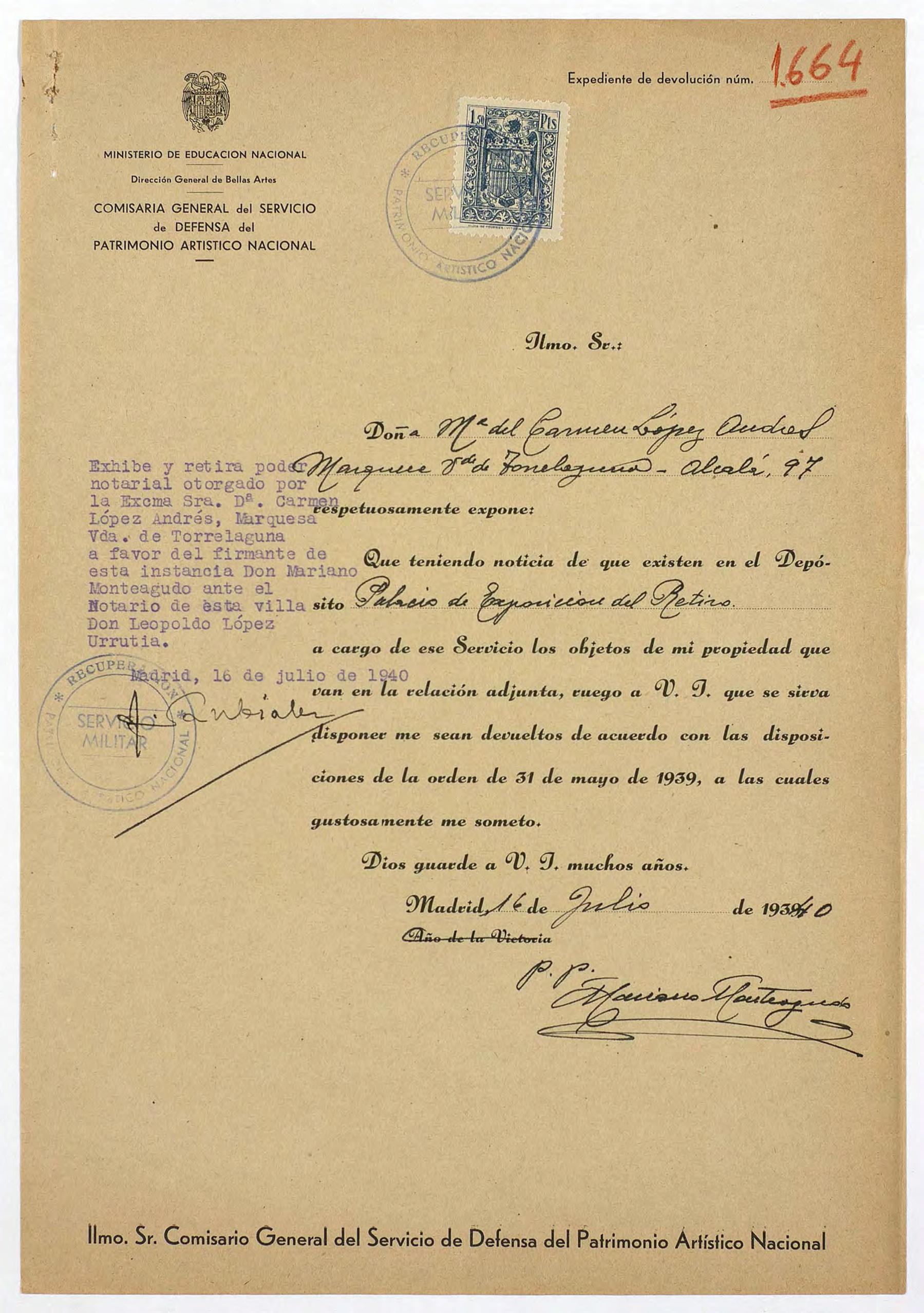 Expediente de devolución de María del Carmen López Andrés, marquesa viuda de Torrelaguna