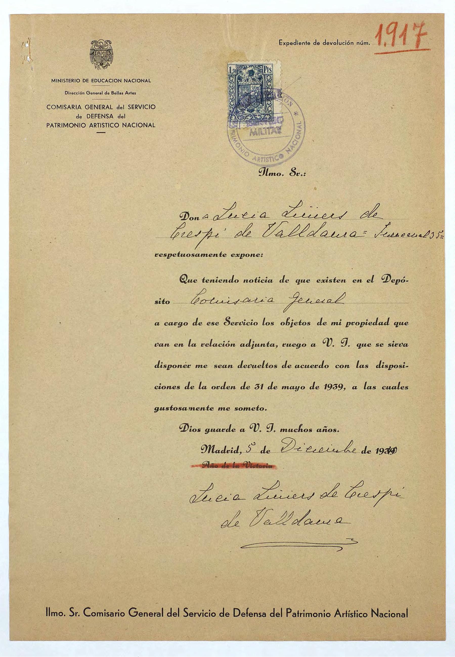 Expediente de devolución de Lucía Liniers de Crespi de Valldaura