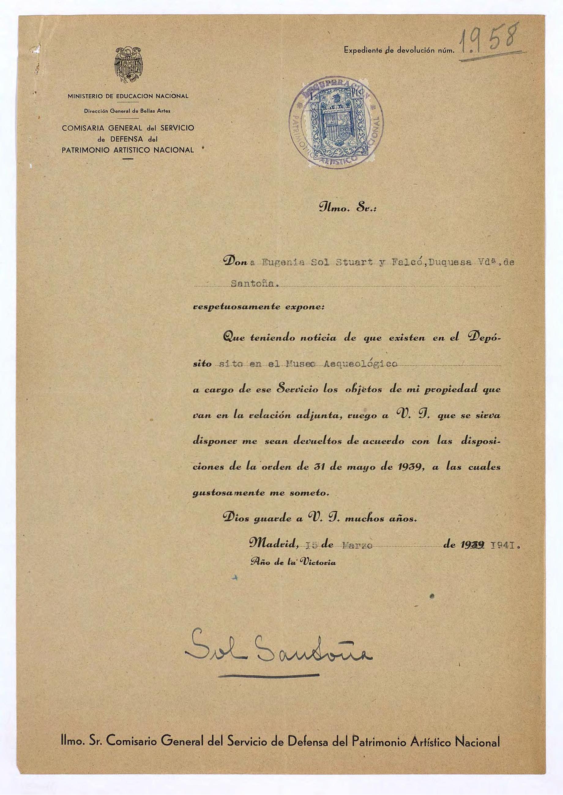 Expediente de devolución de Eugenia Sol Stuart y Falcó, duquesa viuda de Santoña