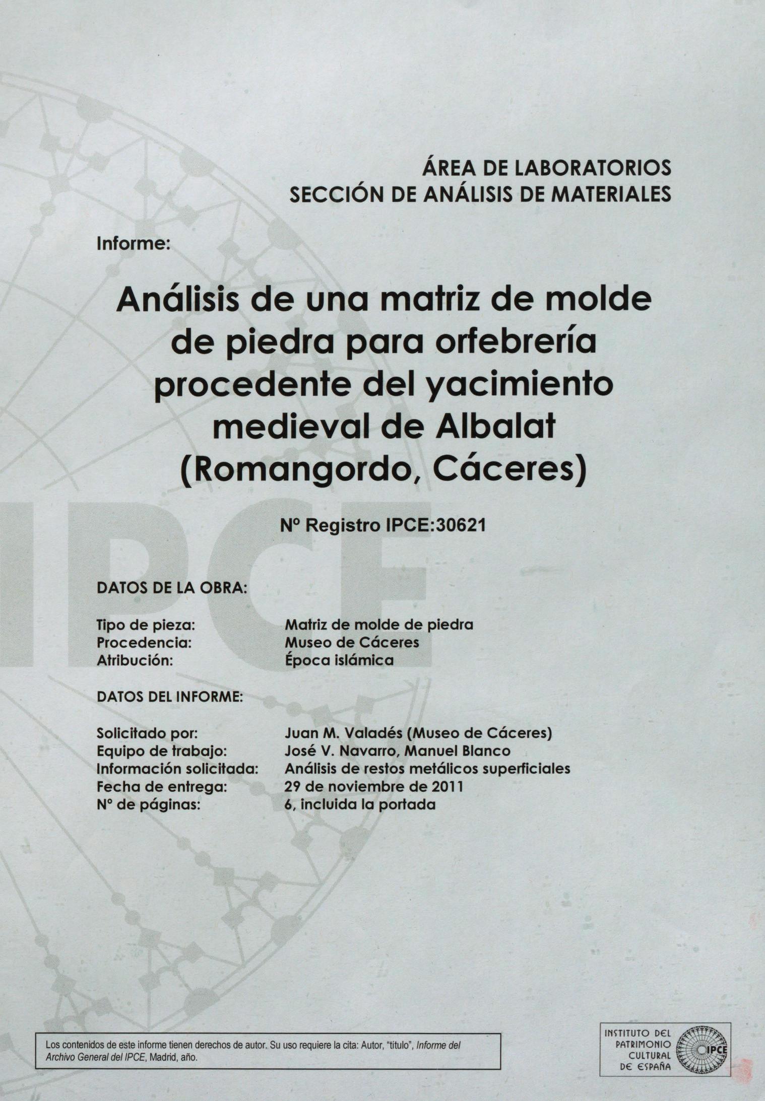 Informe sobre el análisis de una matriz de molde de piedra para orfebrería del yacimiento de Albalat (Romangordo), procedente del Museo de Cáceres