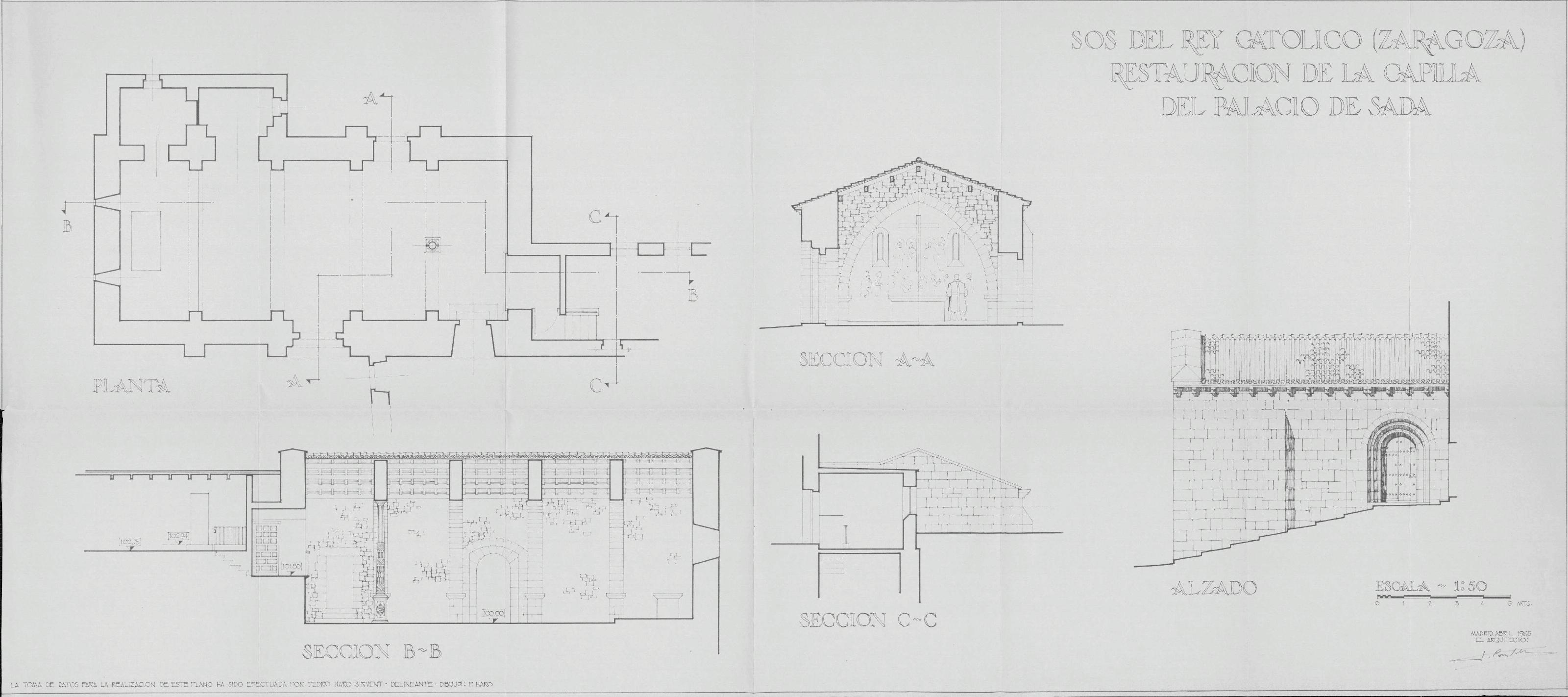 Capilla del Palacio de Sada -Estado Actual- de SOS del Rey Catolico (Zaragoza): Planta Sección A-A Sección B-B Sección C-C Alzado