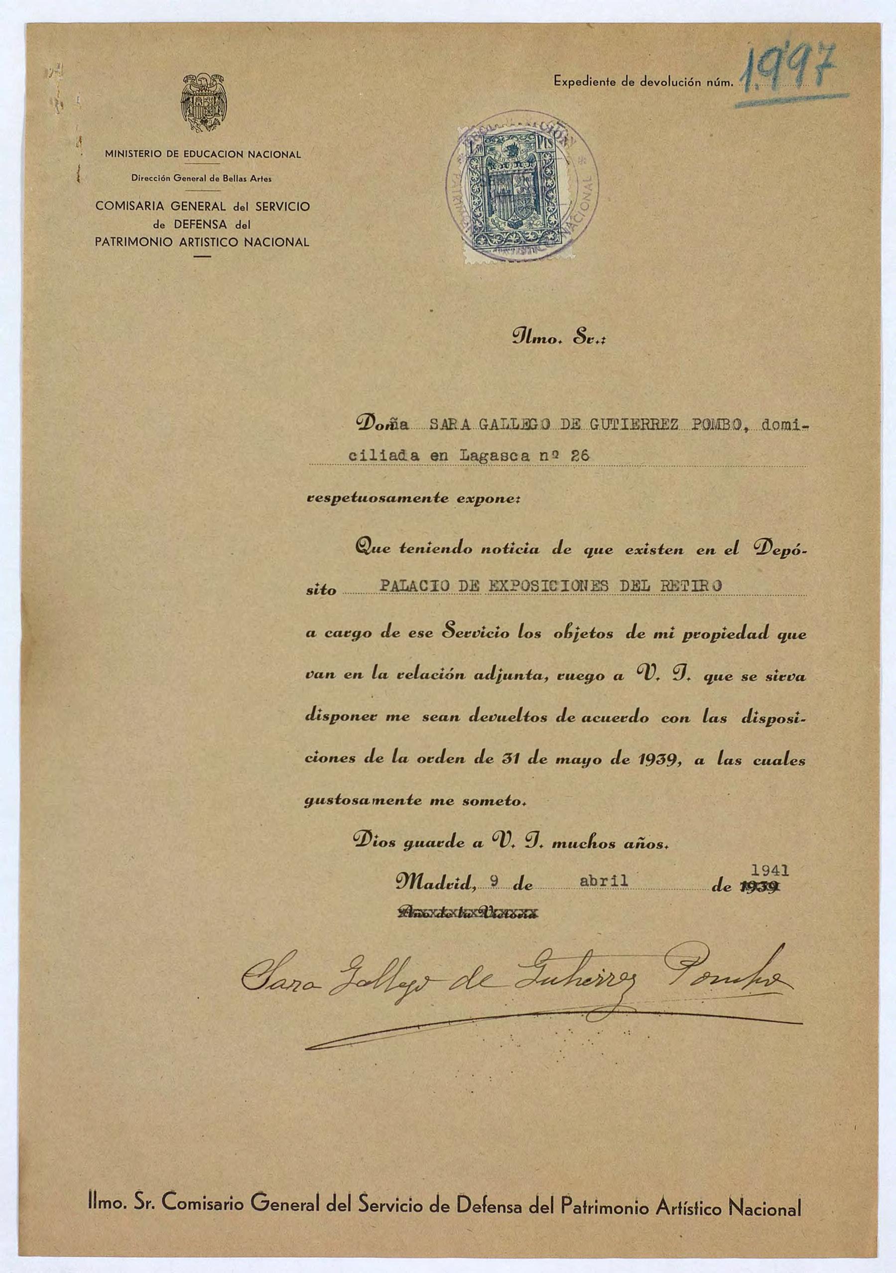 Expediente de devolución de Sara Gallego de Gutiérrez Pombo