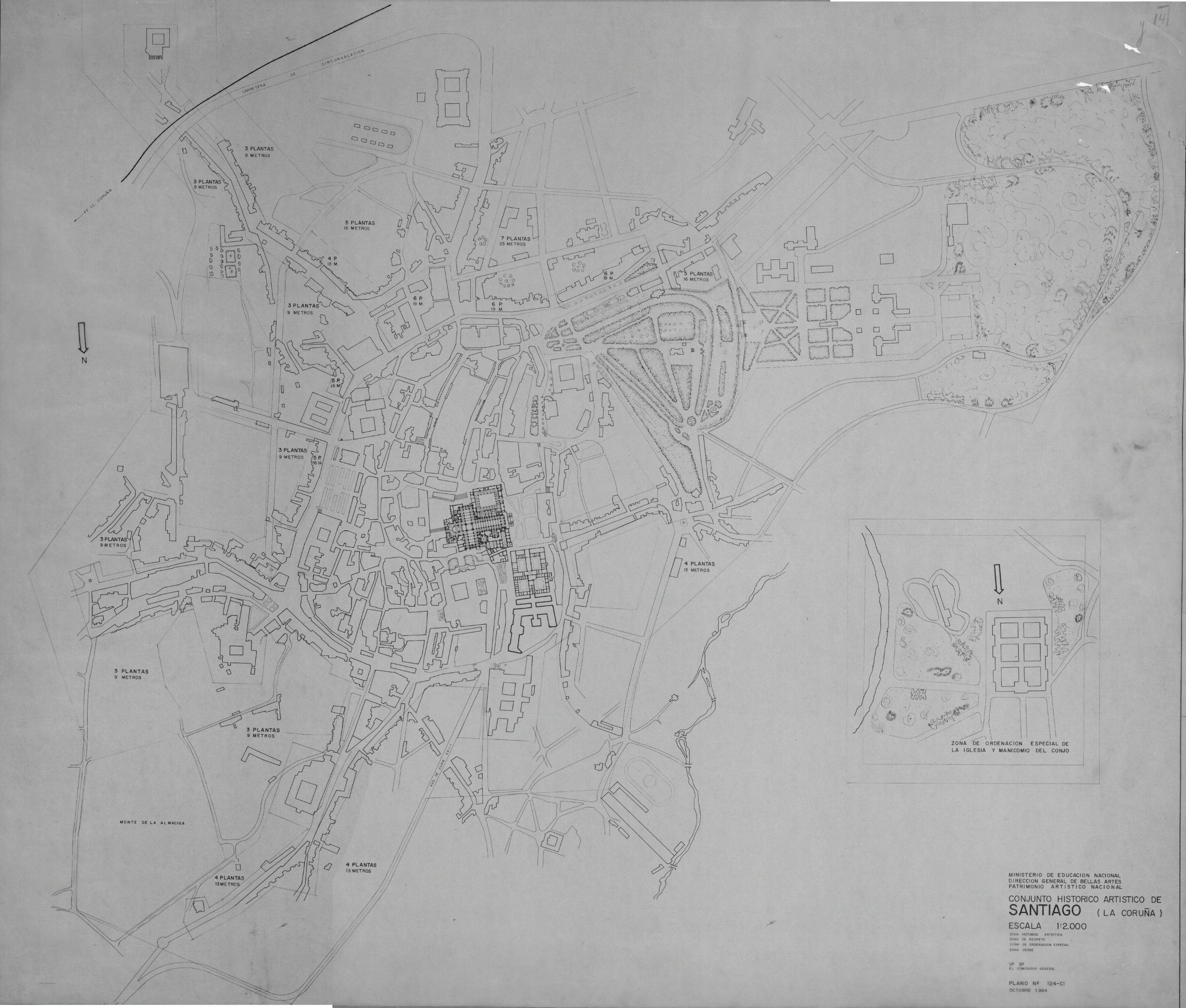 CONJUNTO HISTORICO ARTISTICO DE SANTIAGO DE COMPOSTELA. - LA CORUÑA -: PLANO DE SITUACION, o emplazamiento del conjunto historico .en este plano se marcan varios zonas con distinto tratamiento: historico artistico, de respeto, de ordenacion especial y zona verde. Tambien nos marca la altura en algunos edificios. plano sin cotas.