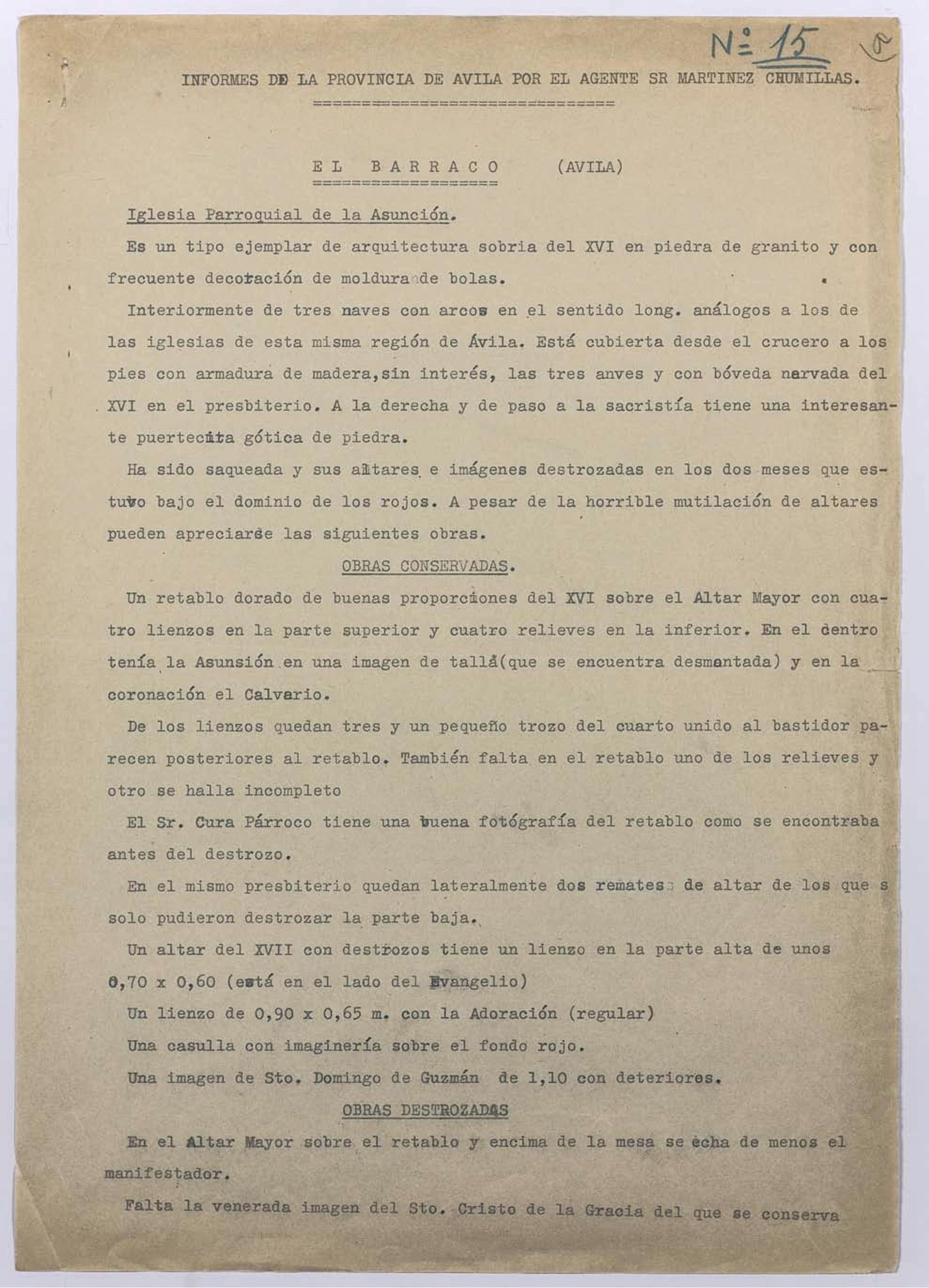Informes de los agentes del Servicio de Recuperación Artística sobre los daños sufridos por el patrimonio en la provincia de Ávila