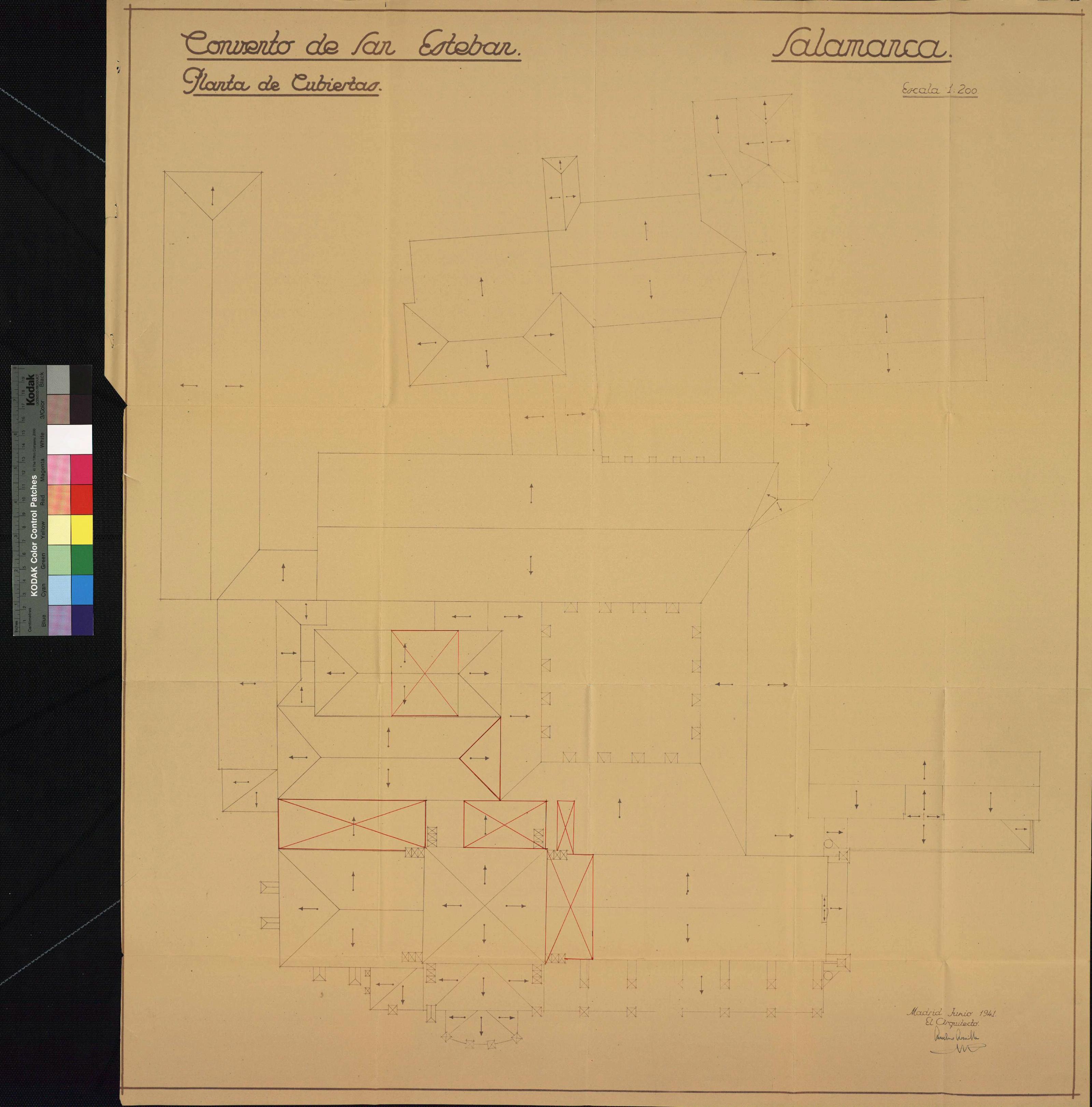 Convento de San Esteban. (Salamanca).: Planta de cubiertas sobre la que se ha coloreado zonas de actuación.