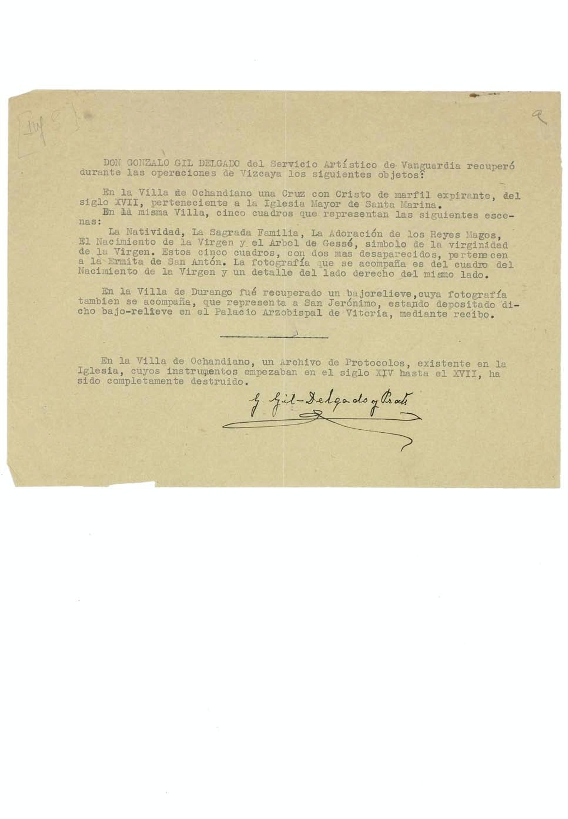 Informes de los agentes del Servicio de Recuperación Artística sobre los daños sufridos por el patrimonio en la provincia de Vizcaya