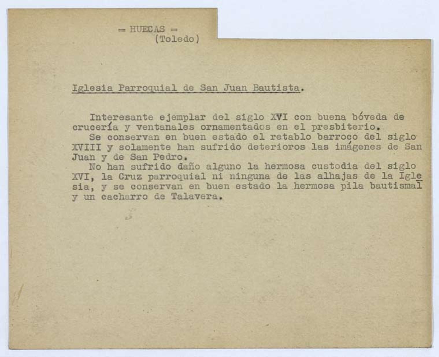 Daños sufridos por la iglesia parroquial de San Juan Bautista (Huecas, Toledo)