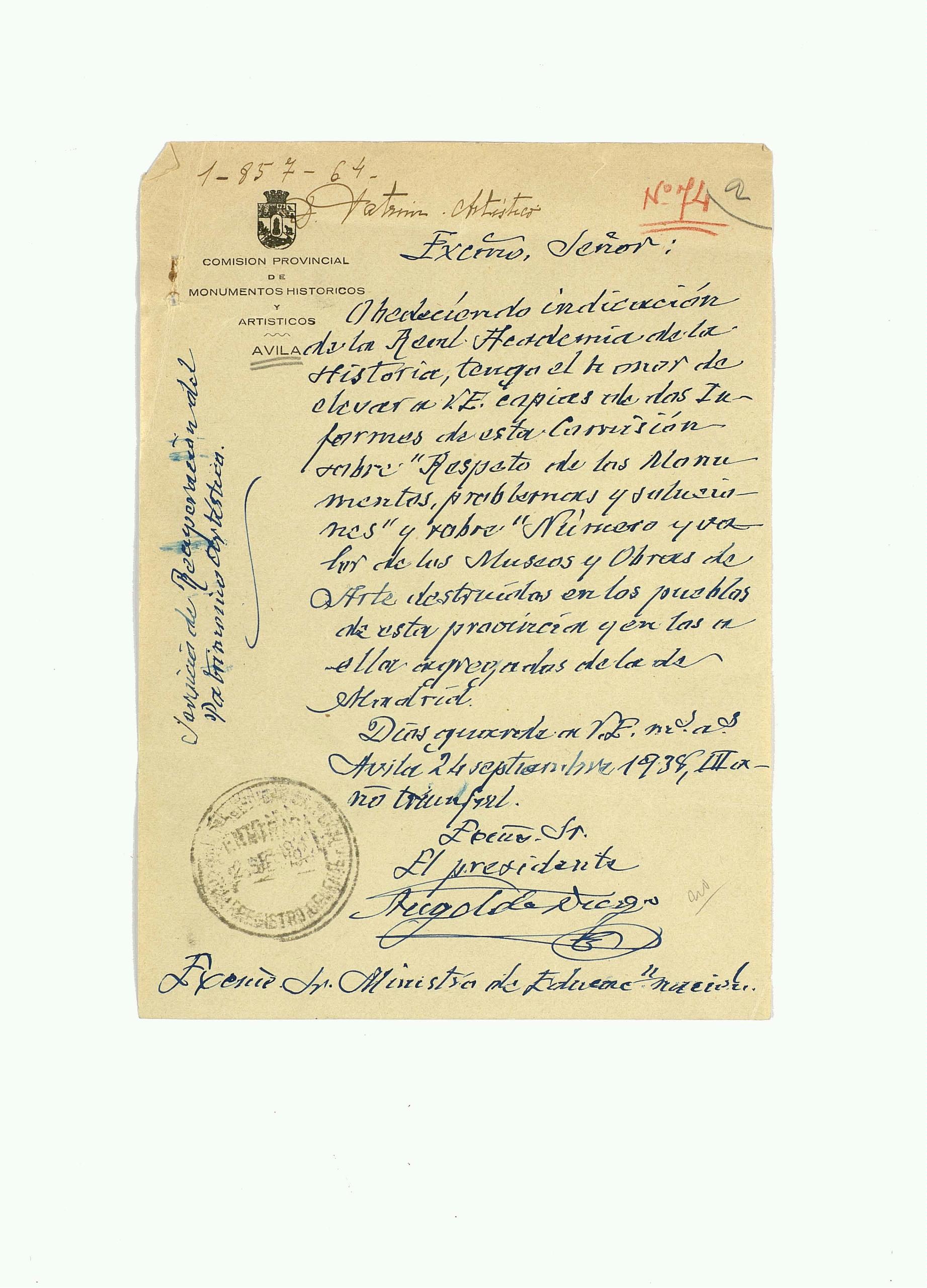 Informes de los asesores del Servicio de Recuperación Artística sobre los daños sufridos por el patrimonio en las provincias de Ávila y de Madrid
