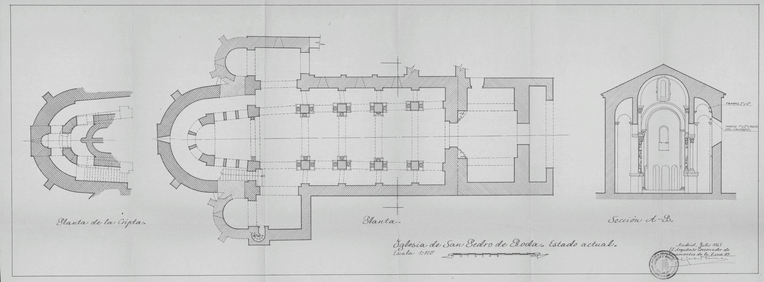 IGLESIA DE SAN PEDRO DE RODA: PLANTA, SECCION A-B Y PLANTA DE LA CRIPTA (ESTADO ACTUAL)