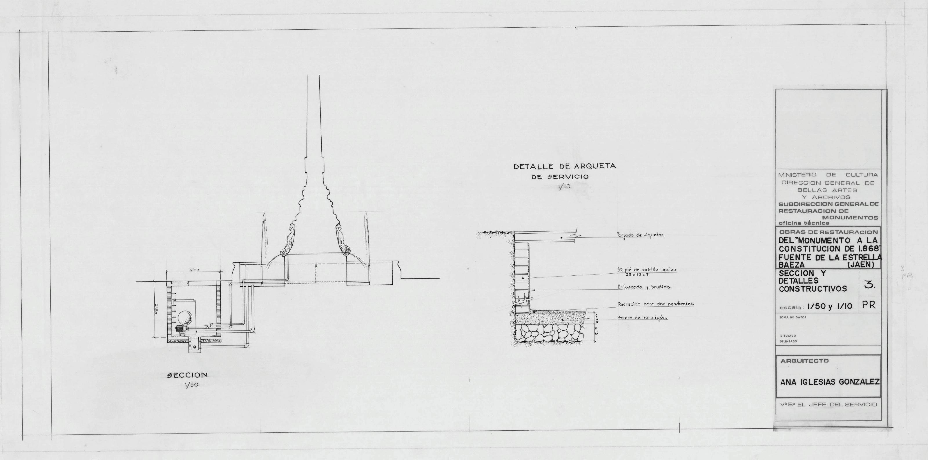 MONUMENTO A LA CONSTITUCION DE 1868. FUENTE DE LA ESTRELLA. BAEZA.: SECCION Y DETALLES CONSTRUCTIVOS, Plano donde señala las tareas y elementos a reparar,