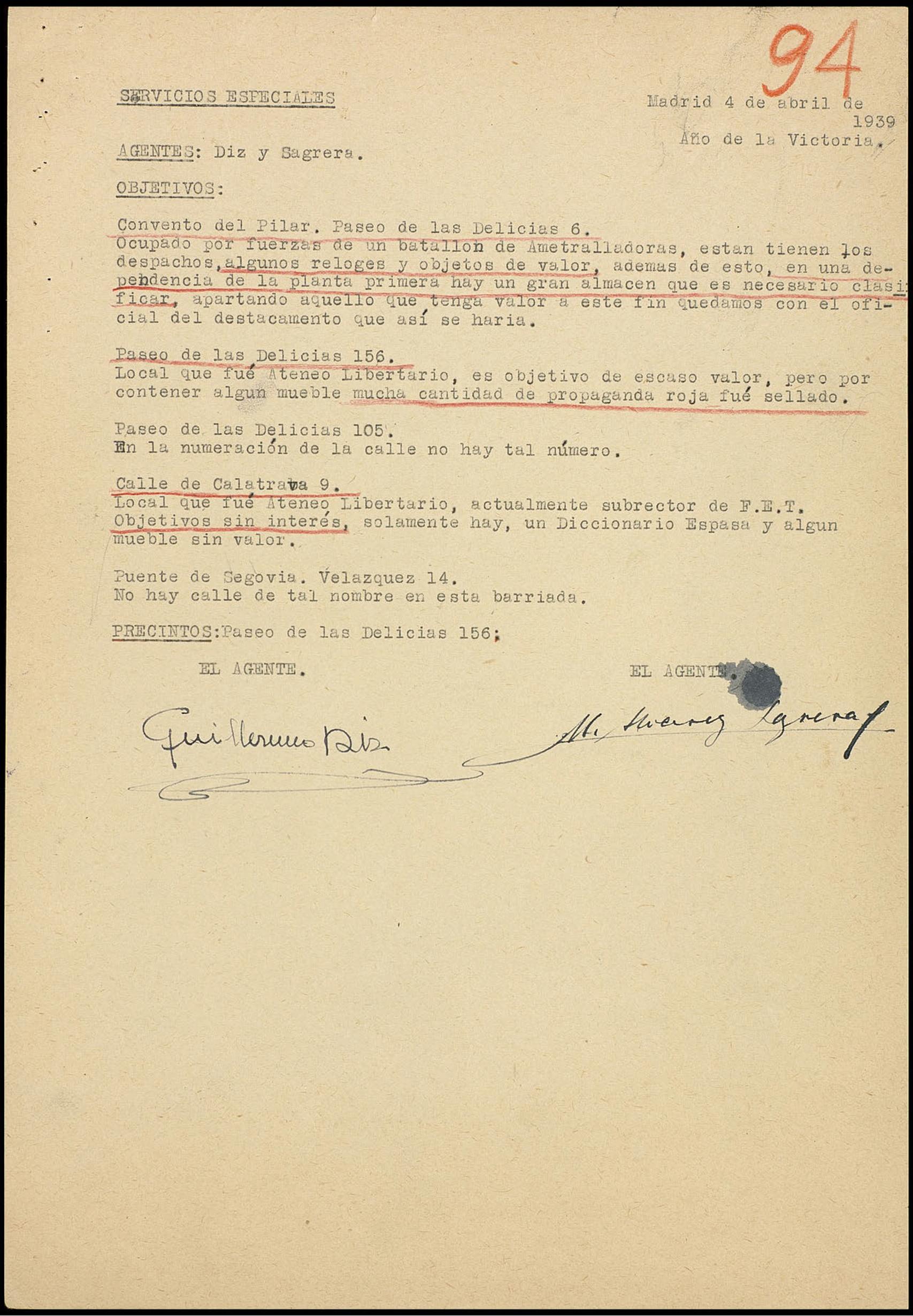 Visitas realizadas por los agentes al Convento del Pilar y a varios locales que fueron Ateneos Libertarios de Madrid