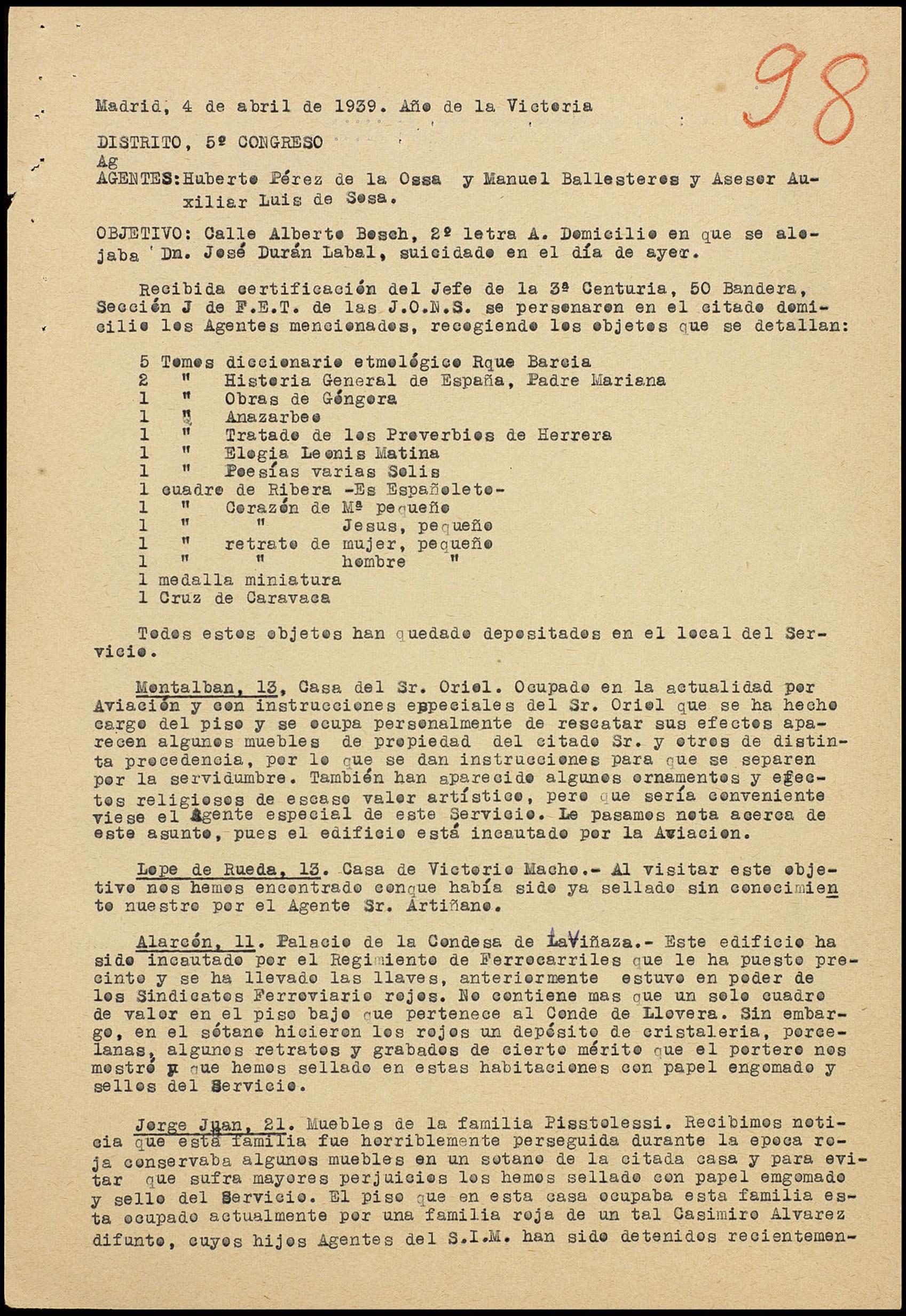 Visitas realizadas por los agentes a un palacio y varios domicilios particulares