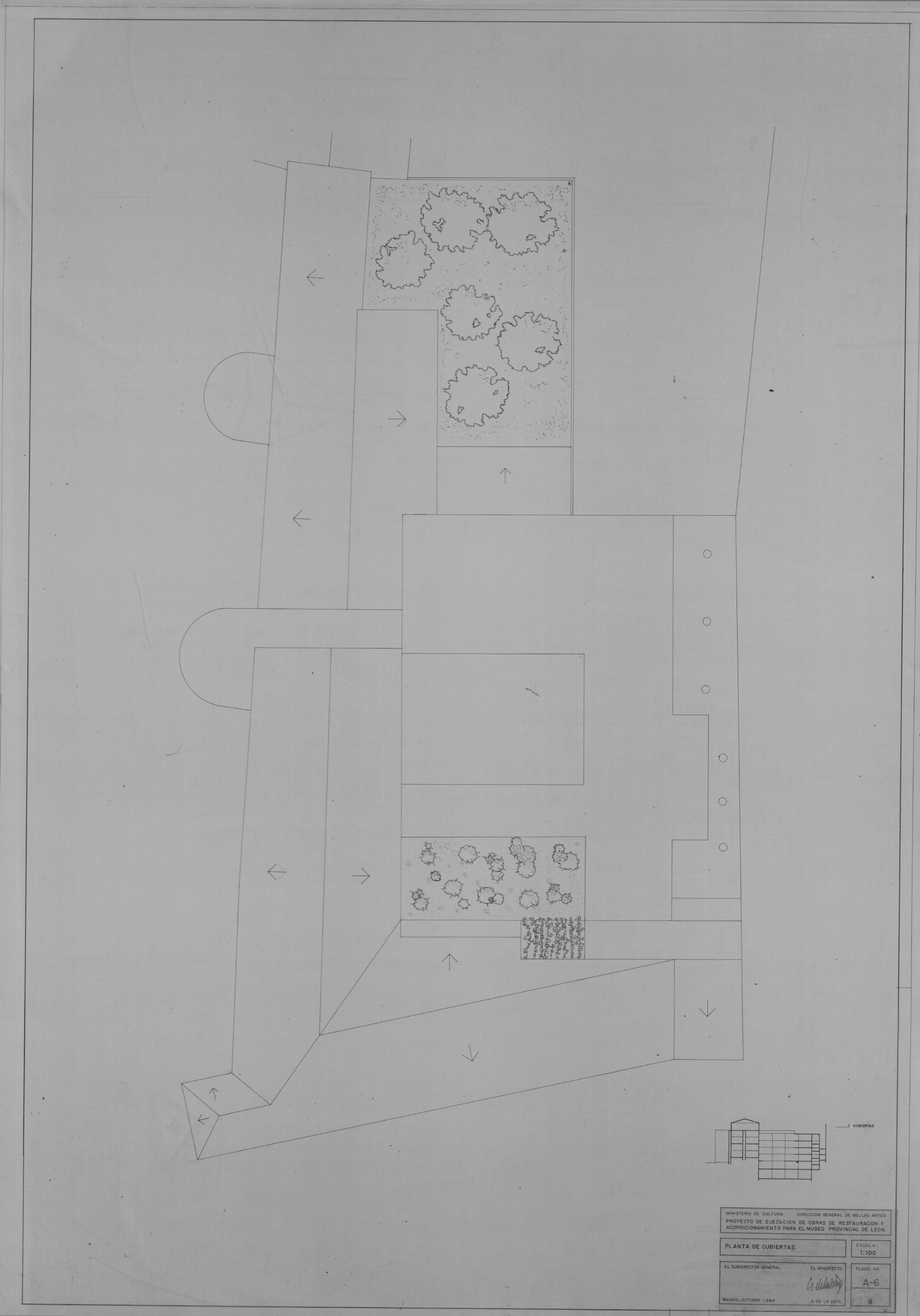 MUSEO PROVINCIAL DE LEON - PROYECTO DE EJECUCION DE OBRAS DE RESTAURACION Y ACONDICIONAMIENTO: PLANTA DE CUBIERTAS Representación simple de limas y pendientes con jardinería y pequeño esquema sobre sello indicando sobre una sección el nivel al que corresponde la planta. Firmado