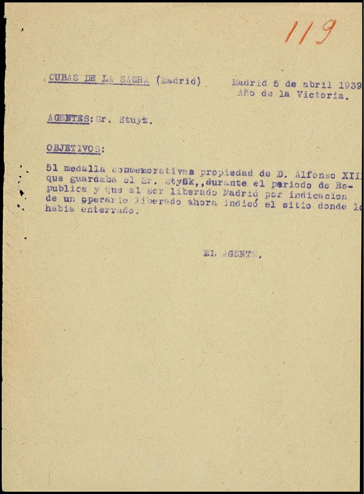 Visitas realizadas por los agentes a Cubas de la Sagra (Madrid) buscando unas medallas conmemorativas de Alfonso XIII