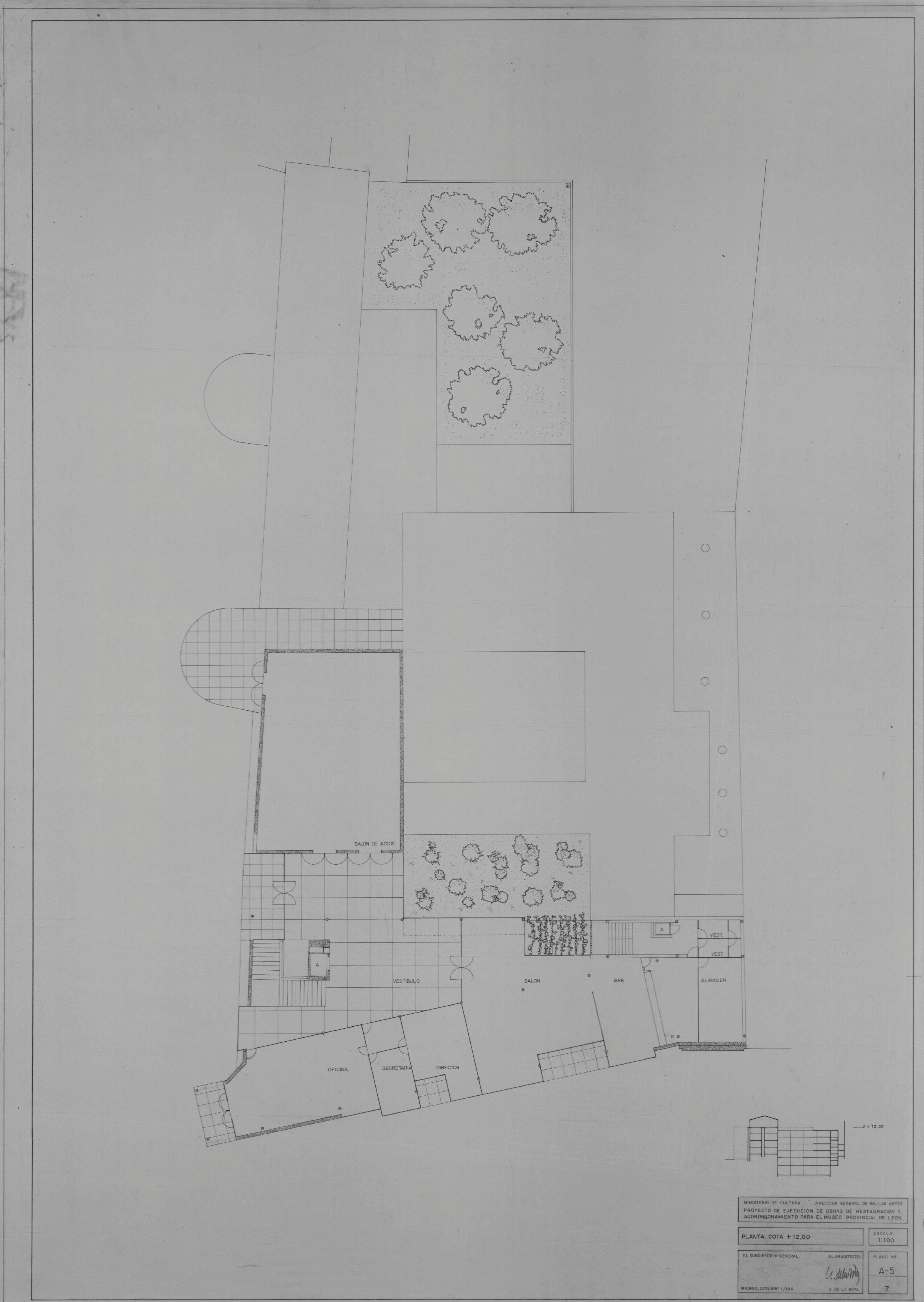 MUSEO PROVINCIAL DE LEON - PROYECTO DE EJECUCION DE OBRAS DE RESTAURACION Y ACONDICIONAMIENTO: PLANTA (cota+12.00) Con denominación de estancias, comunicaciones verticales de ascensores y escaleras, solado y jardinería y pequeño esquema sobre sello indicando sobre una sección el nivel al que corresponde la planta. Firmado