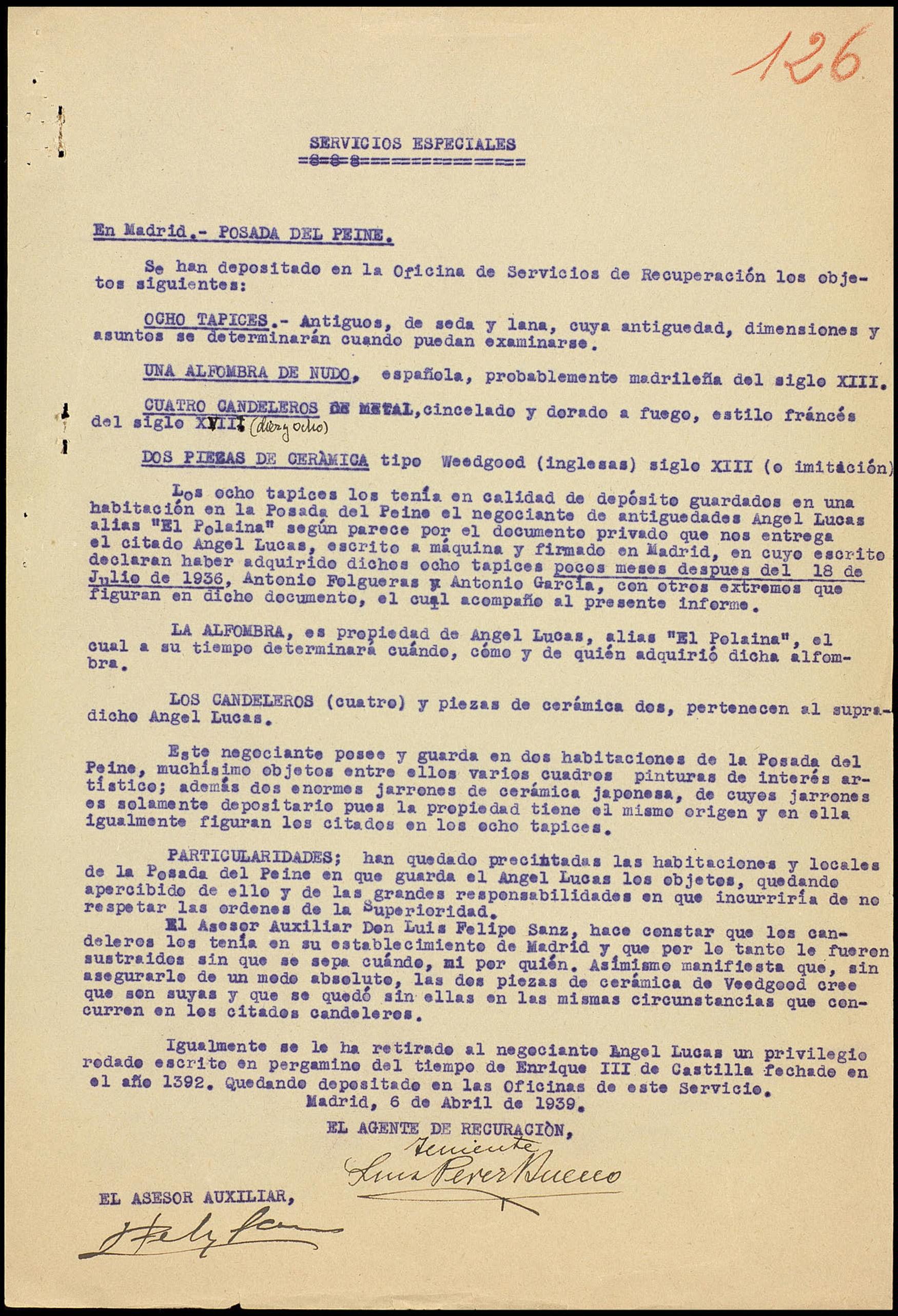 Relación de los objetos retirados de la Posada del Peine de Madrid y depositados en la Oficina de Servicios de Recuperación