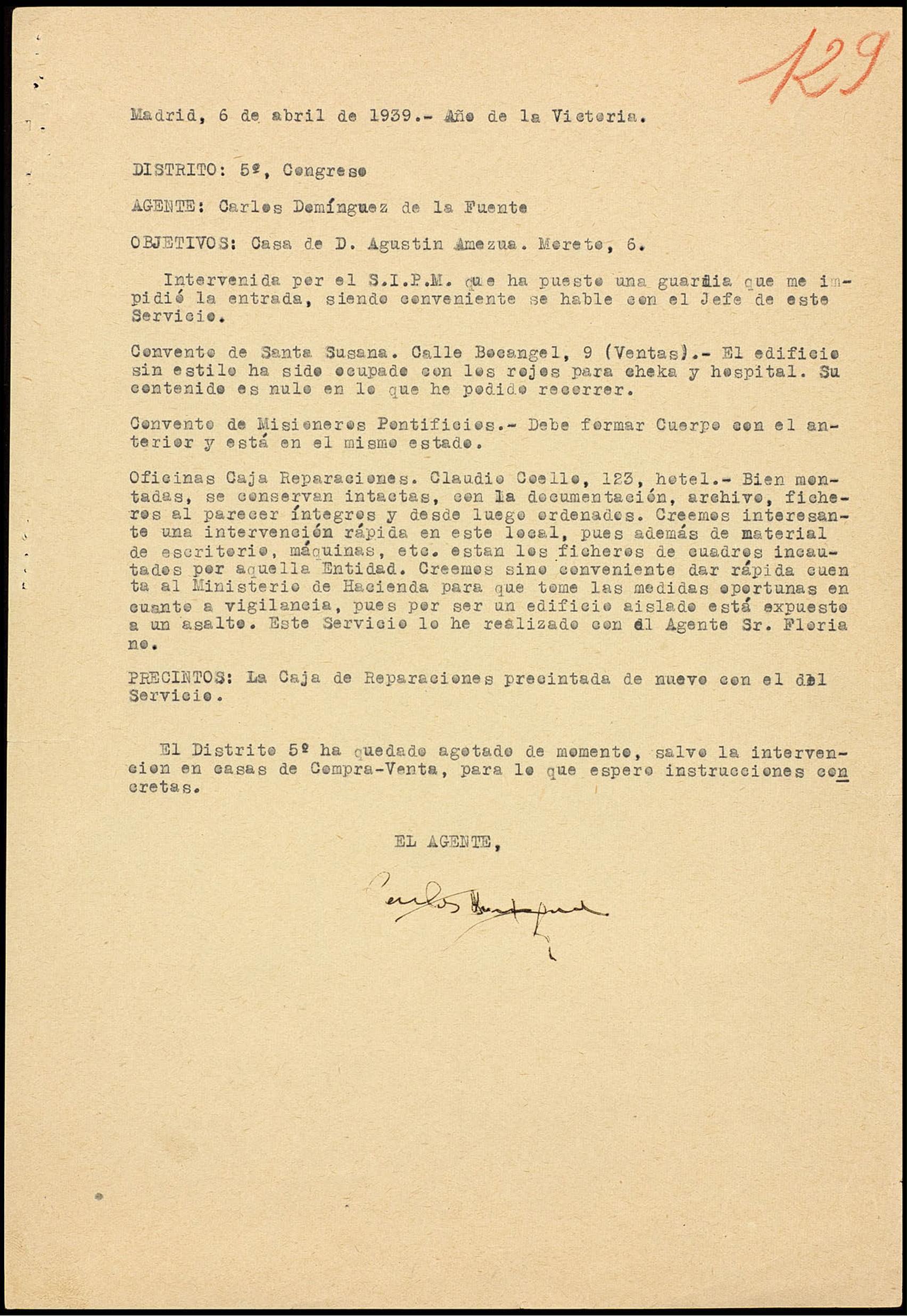 Visitas realizadas por los agentes a un domicilio particular, dos conventos y a las oficinas de la Caja de Reparaciones de Madrid
