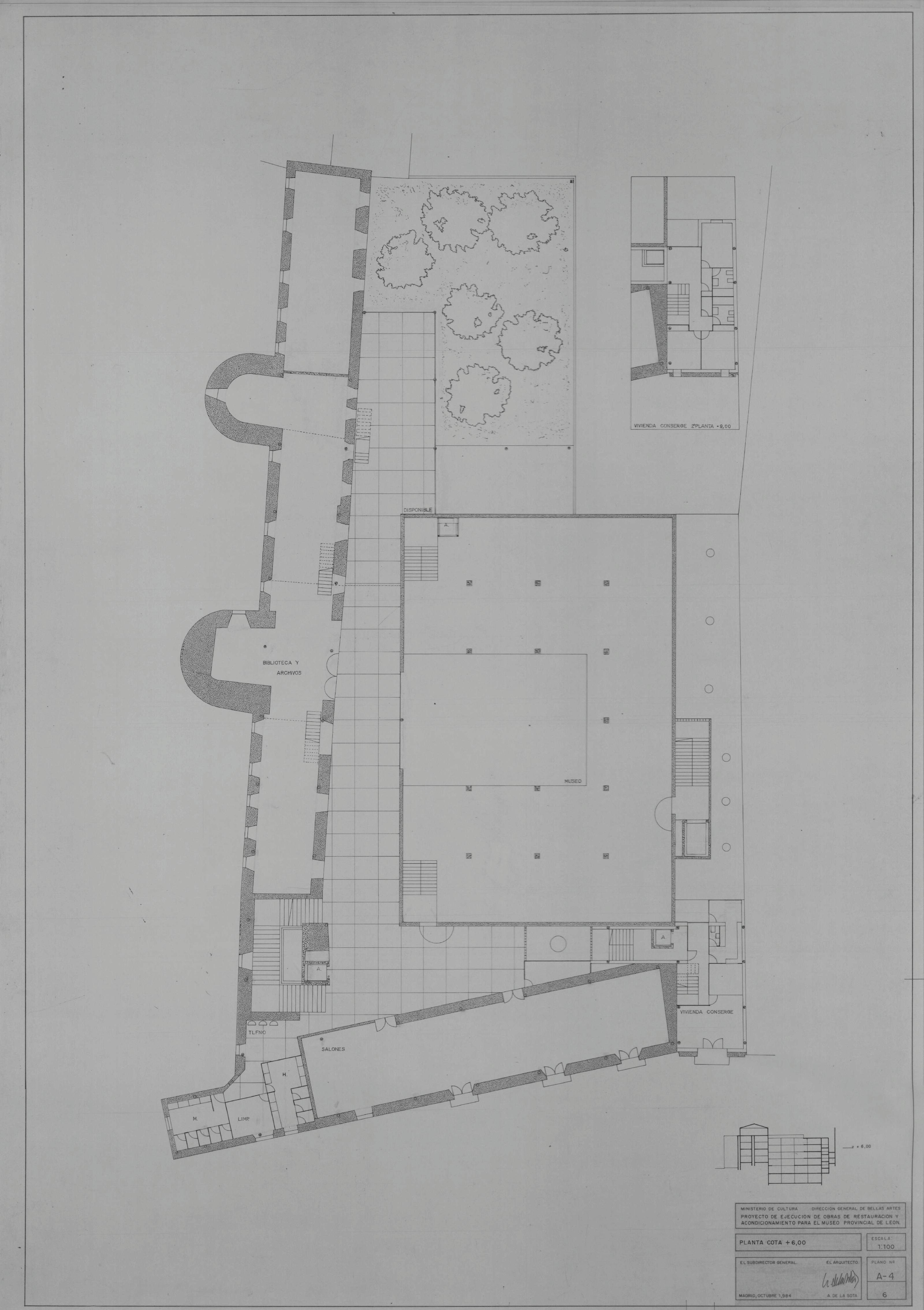 MUSEO PROVINCIAL DE LEON - PROYECTO DE EJECUCION DE OBRAS DE RESTAURACION Y ACONDICIONAMIENTO: PLANTA (cota+6.00)Incluye planta de vivienda de conserje en 2ª planta (cota +9.00) Con denominación de estancias, comunicaciones verticales de ascensores y escaleras, solado y jardinería y pequeño esquema sobre sello indicando sobre una sección el nivel al que corresponde la planta. Firmado