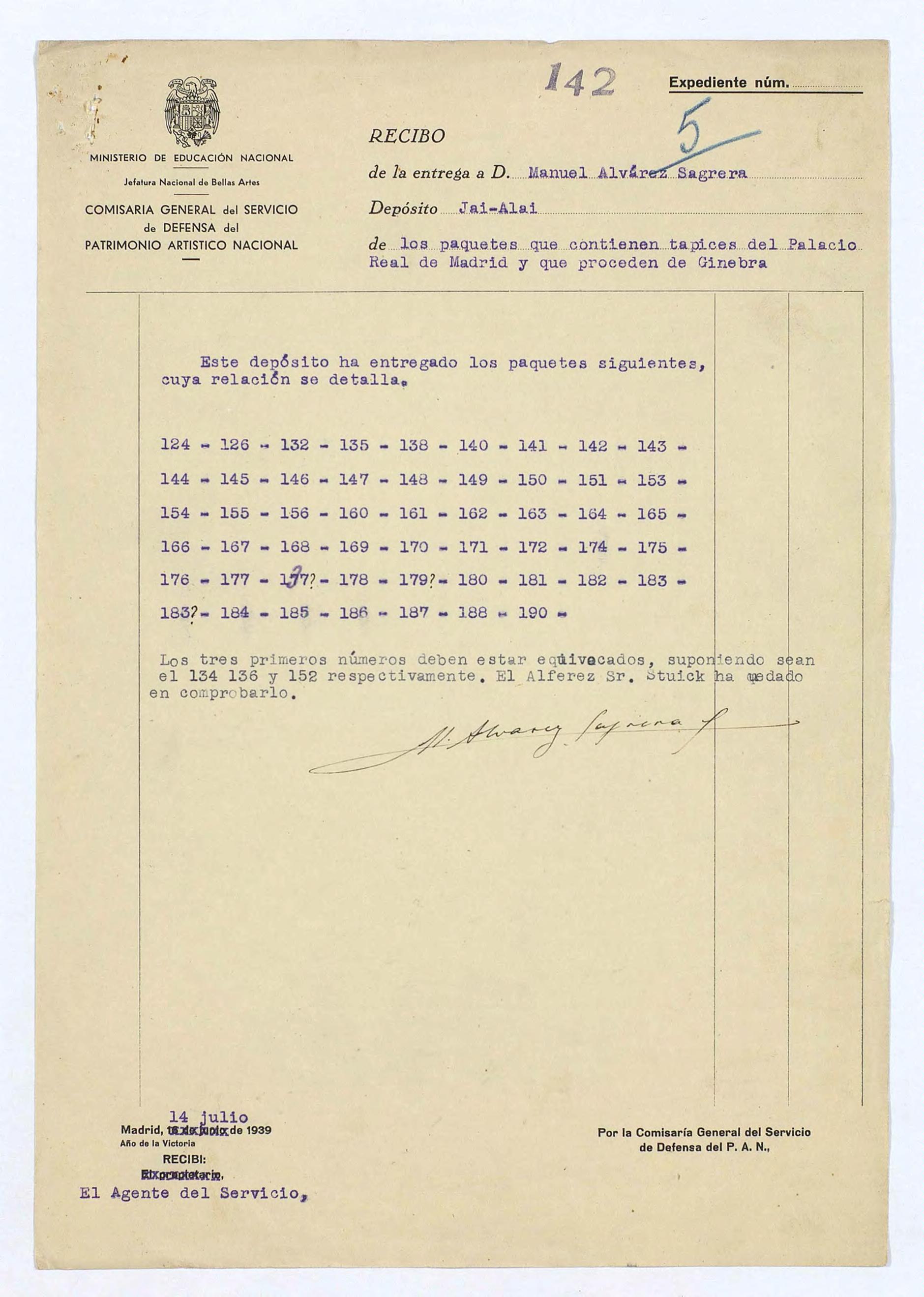 Expediente de entrega en depósito a Manuel Álvarez Sagrera de los paquetes que contienen tapices del Palacio Real de Madrid que proceden de Ginebra