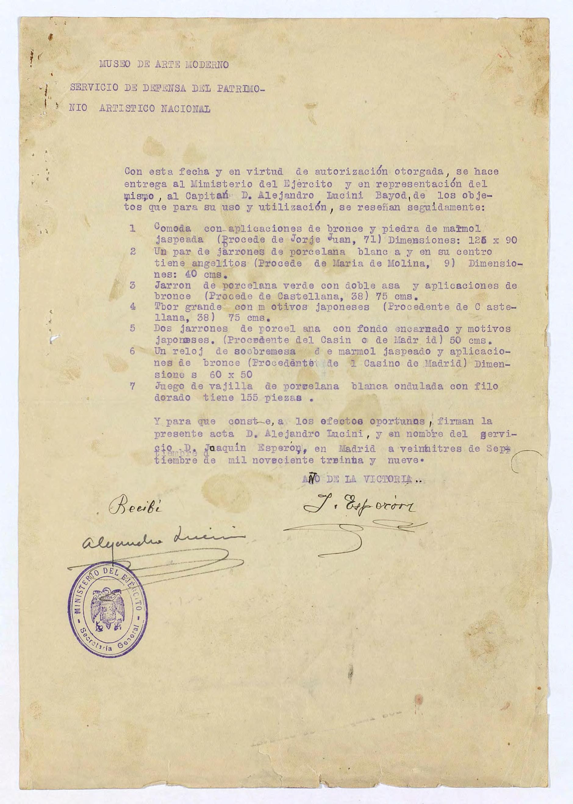 Expediente de entrega de objetos en depósito al Museo del Ejército