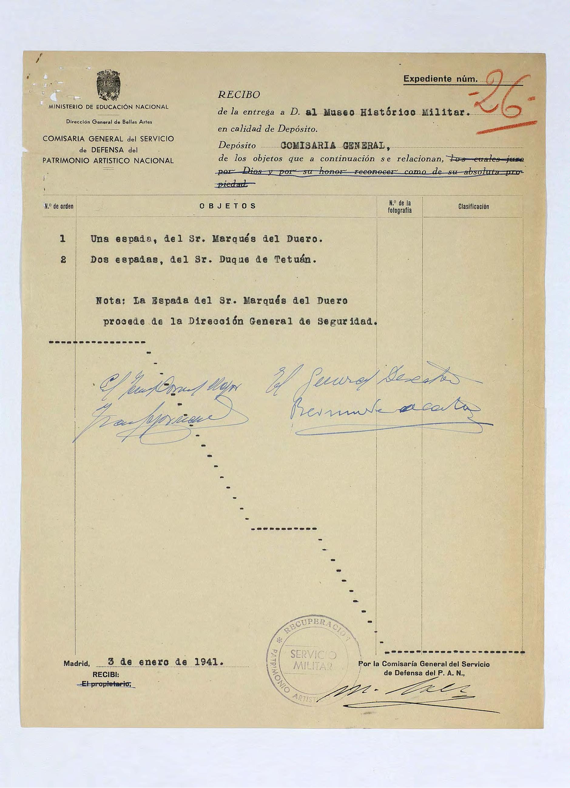 Expediente de entrega de objetos en depósito al Museo Histórico Militar