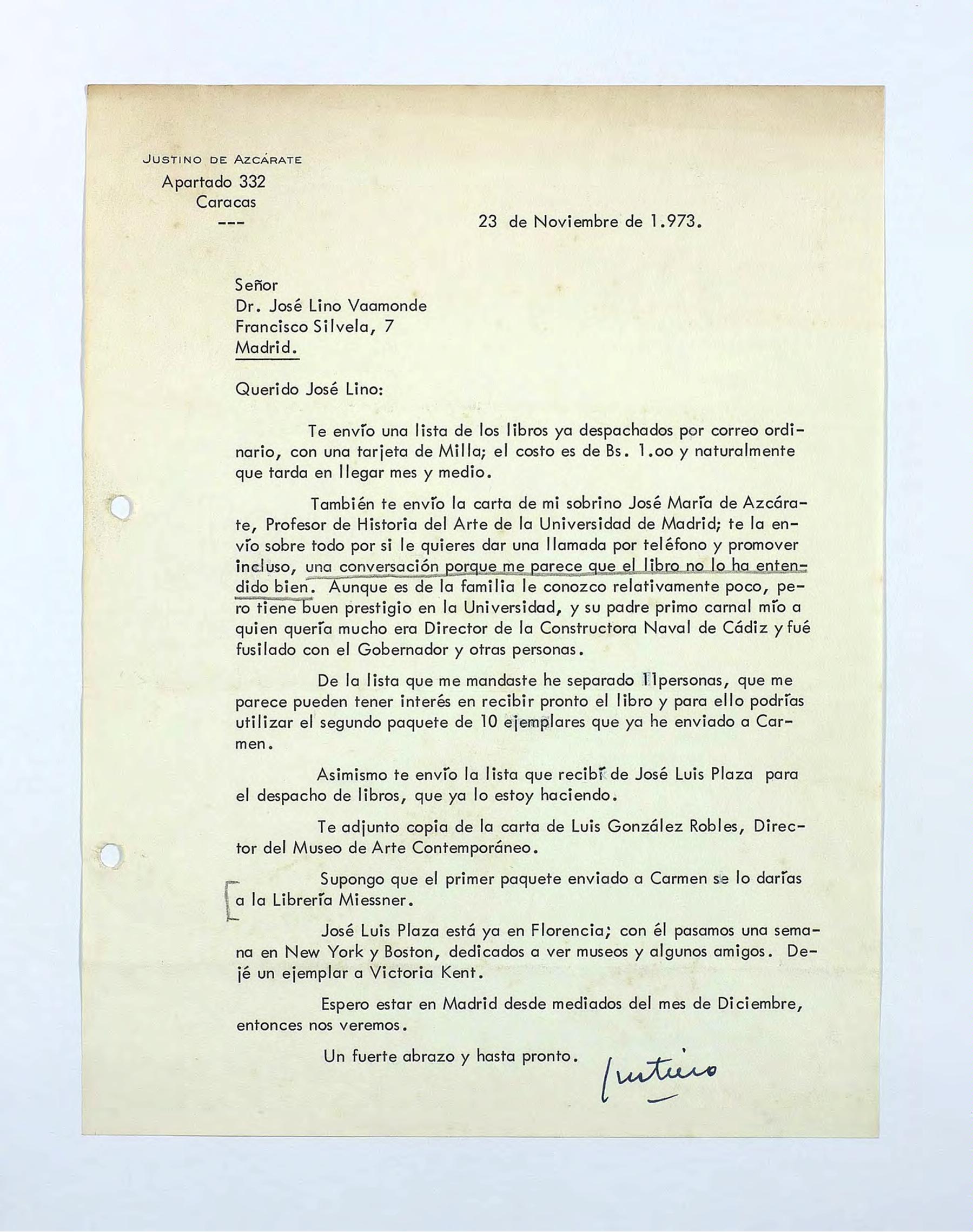 Carta mecanografiada de una página remitida por parte de D. Justino de Azcárate a D. José Lino Vaamonde junto a la cual adjunta una lista de cuatro páginas de los libros ya despachados, junto a una carta de D. Luis González Robles, Director del Museo Español de Arte Contemporáneo, dirigida a D. Justino de Azcárate.