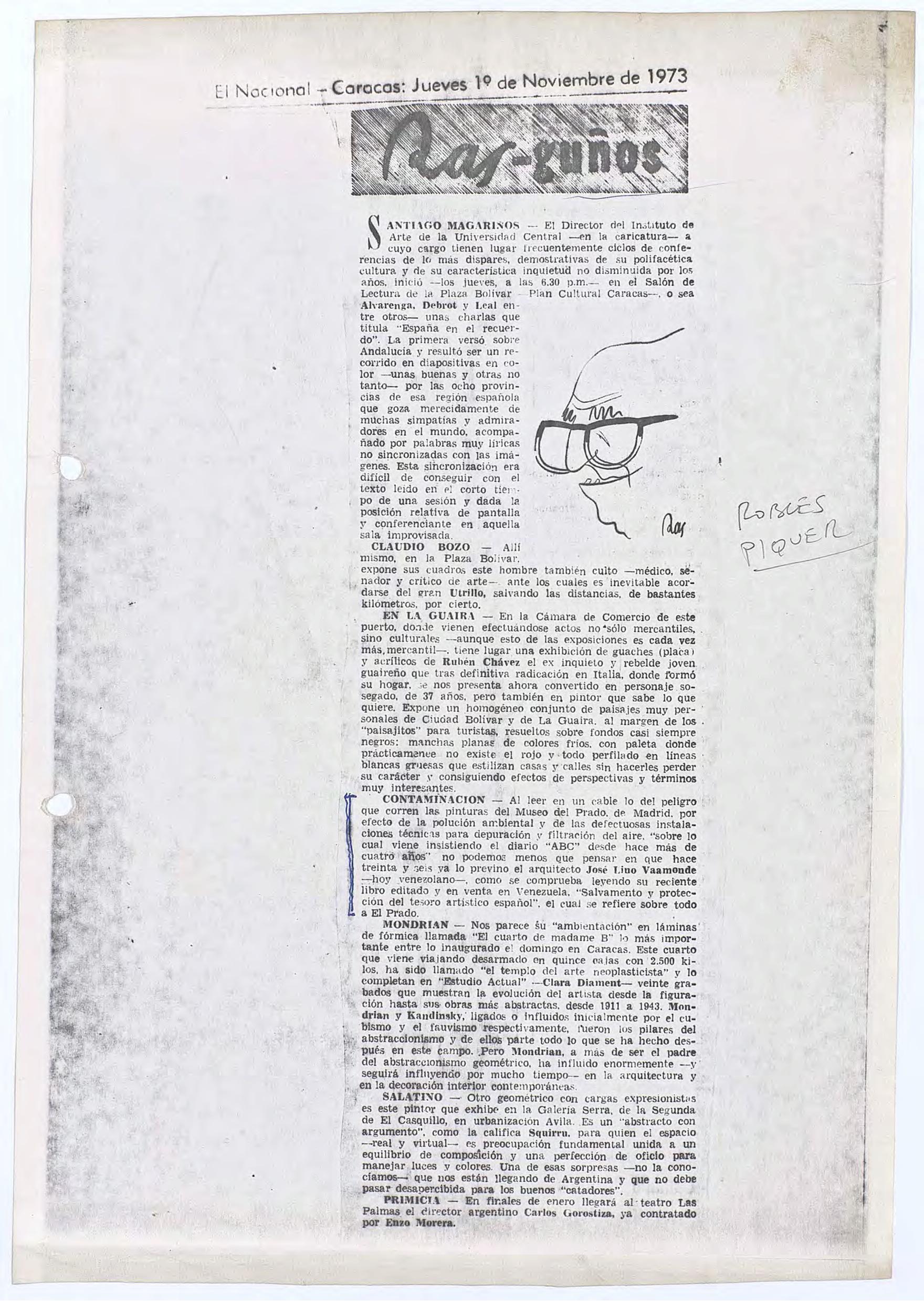 Fotocopia del recorte del diario El Nacional de Caracas, sección Ras-guños. Artículo titulado "Contaminación". Está manuscrito por José Lino a lápiz en la hoja el nombre de Robles Piquer.