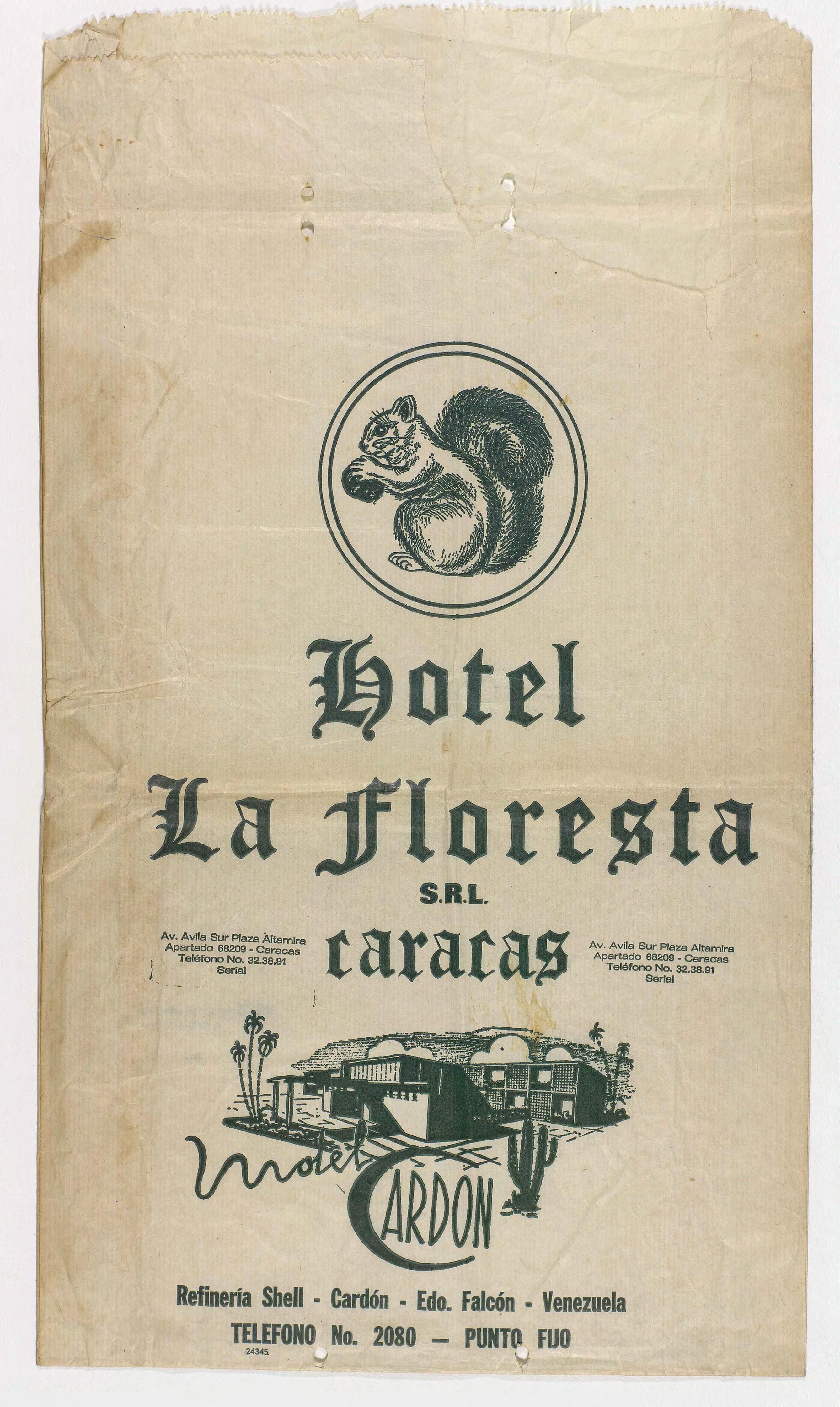 Bolsa de papel doblada del Hotel La Floresta con nota manuscrita: Fotos "bautizo" sic. [Presentación del libro Salvamento y Protección del Tesoro Artístico Español del arquitecto Joselino Vaamonde V.] que contenía 5 fotos en blanco y negro del evento.