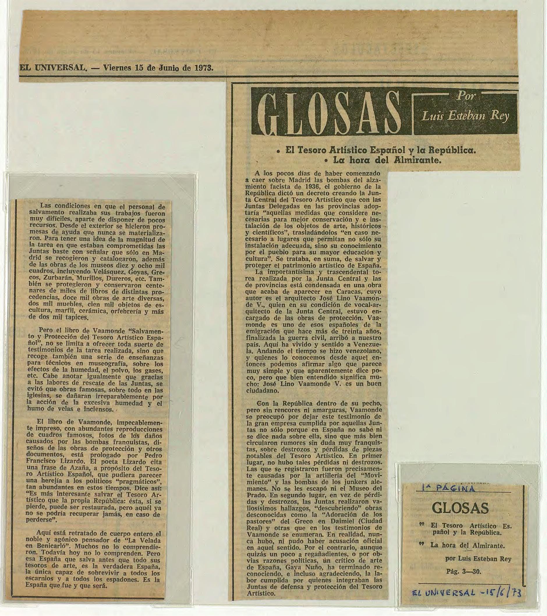 Recorte de periódico, sección Glosas. Artículo de Luis Esteban Rey titulado "El Tesoro Artístico Español y la República".