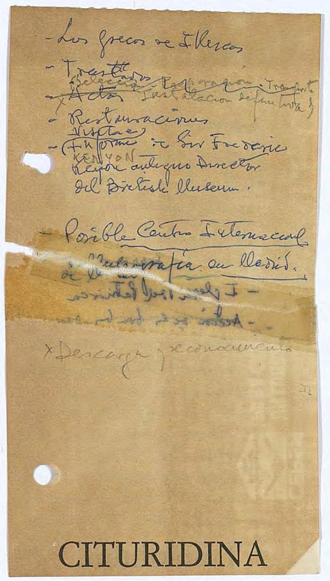 Hoja de notas pequeña con anotaciones manuscritas en la que aparecen "algunos capítulos de la obra".