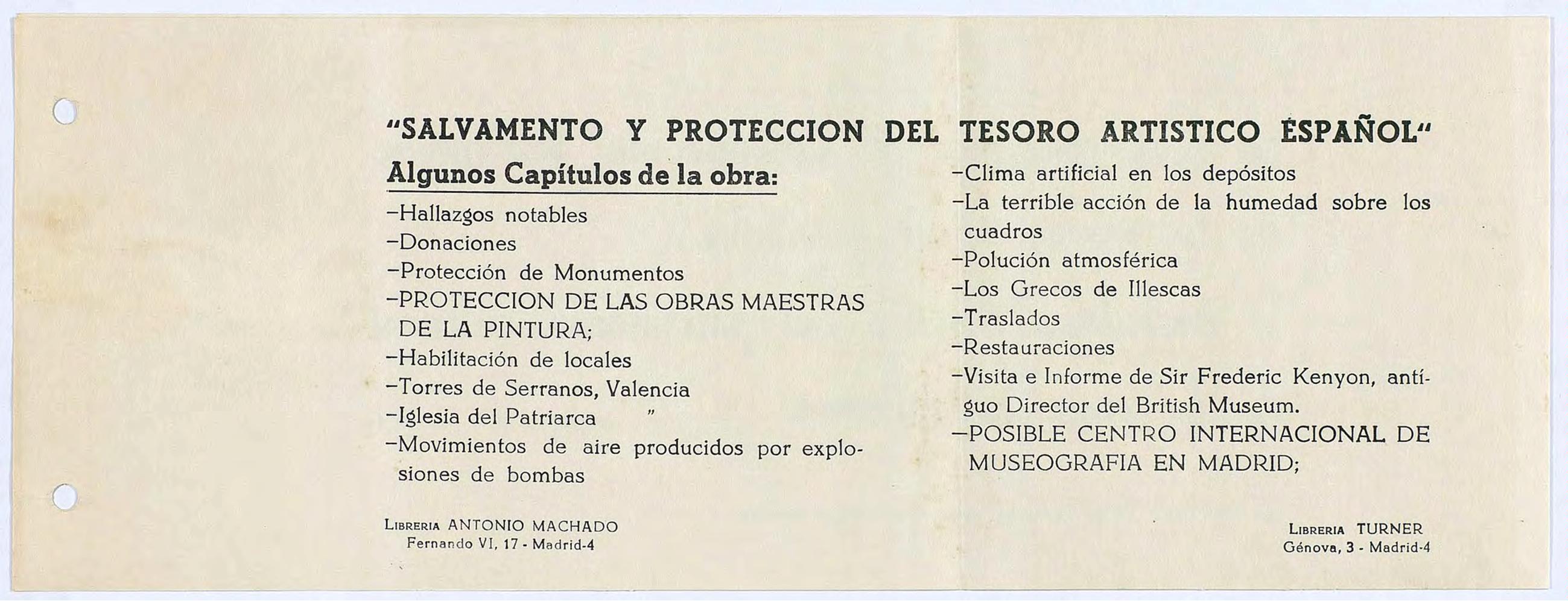 Escrito impreso donde aparecen Algunos capítulos de la obra Salvamento y Protección del Tesoro Artístico Español, con los nombres en la zona inferior de la Librería Antonio Machado y de la Librería Turner de Madrid, detrás recoge una frase del autor, el arquitecto José Lino Vaamonde: un impresionante y desconocido testimonio de la guerra civil española: la cuidadosa defensa del patrimonio cultural en la zona republicana.