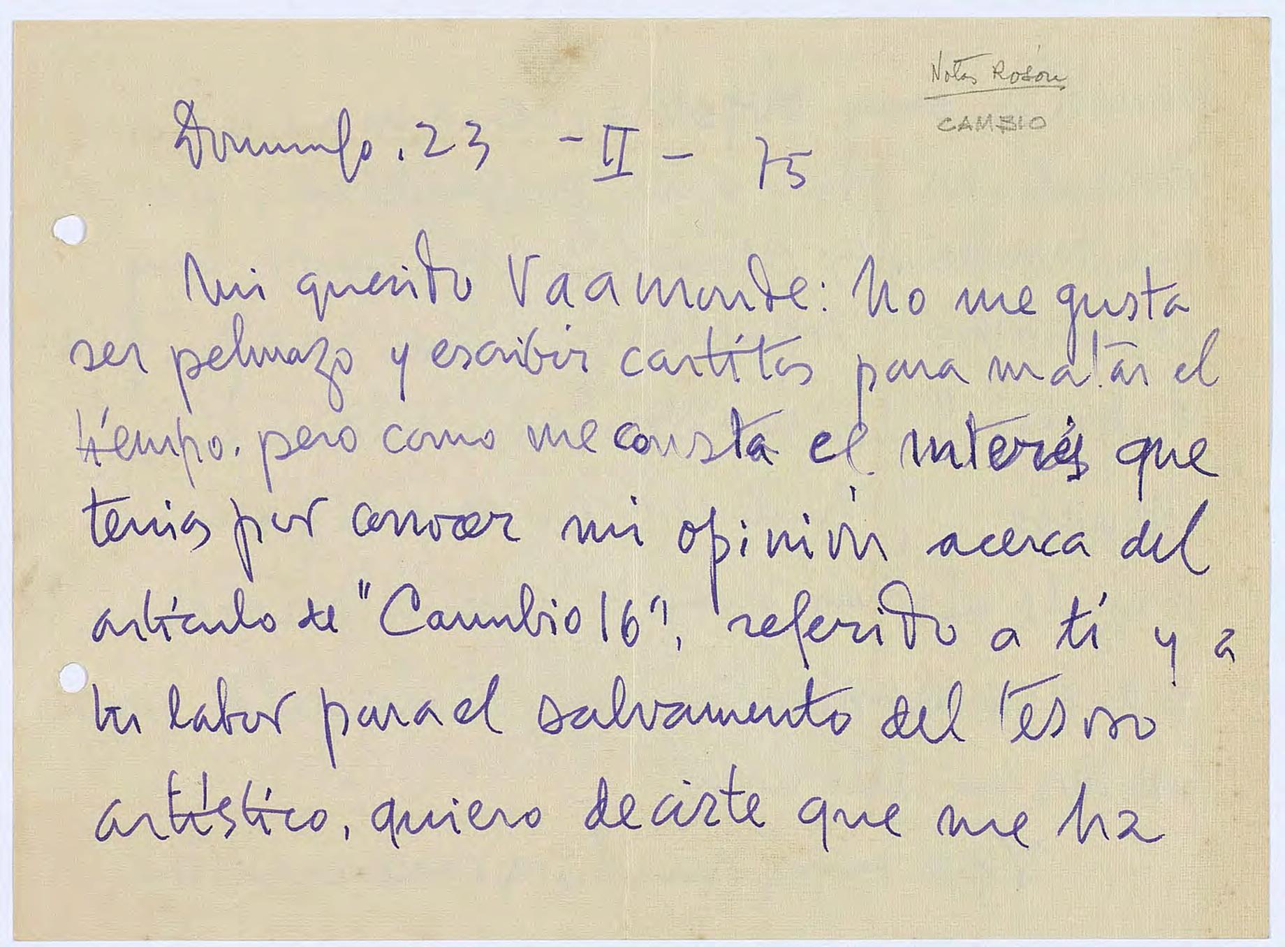 Carta manuscrita tamaño cuartilla de Manolo sic. a Vaamonde en el que le manifiesta su opinión sobre el artículo publicado en Cambio 16. (2 cuartillas)