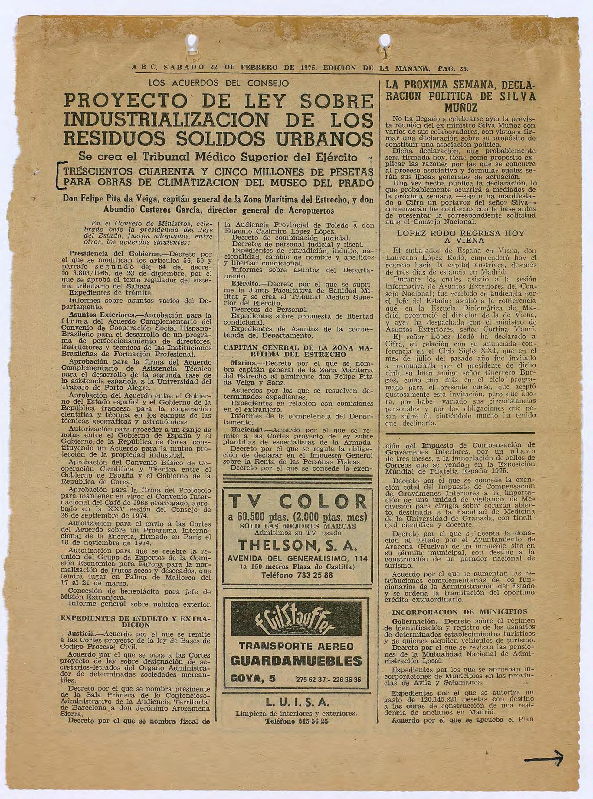 Artículo titulado "Demanda laboral contra el Museo del Prado", publicado en el Diario ABC , pág. 40. (Pegado a una hoja en blanco deteriorada debido a la acidez del papel de periódico y al artículo "Trescientos cuarenta y ocho millones de pesetas para obras de climatización del Museo del Prado" publicado en la misma fecha).