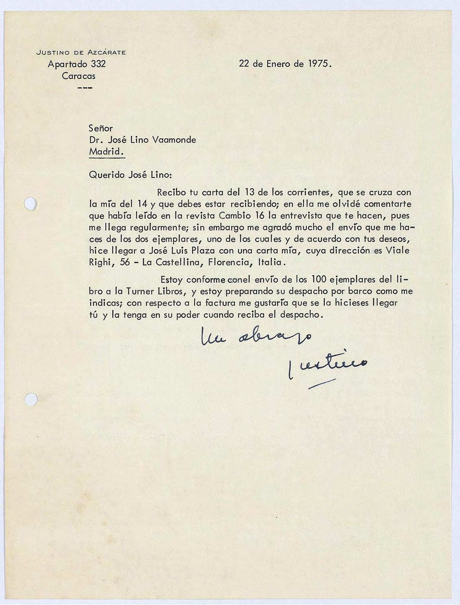 Carta mecanografiada (1 página) dirigida por Justino de Azcárate a José Lino Vaamonde.