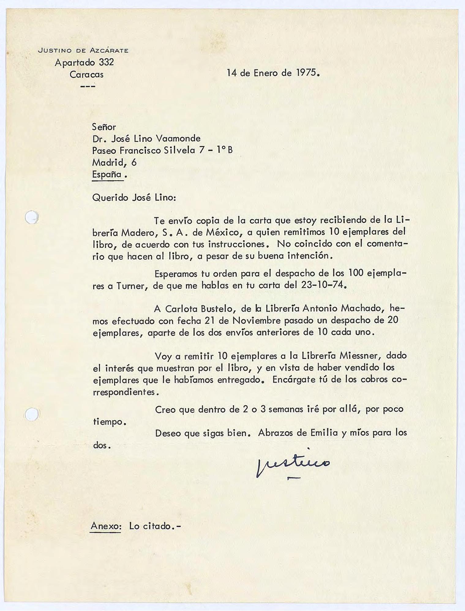 Carta mecanografiada (1 página) dirigida por Justino de Azcárate a José Lino Vaamonde.