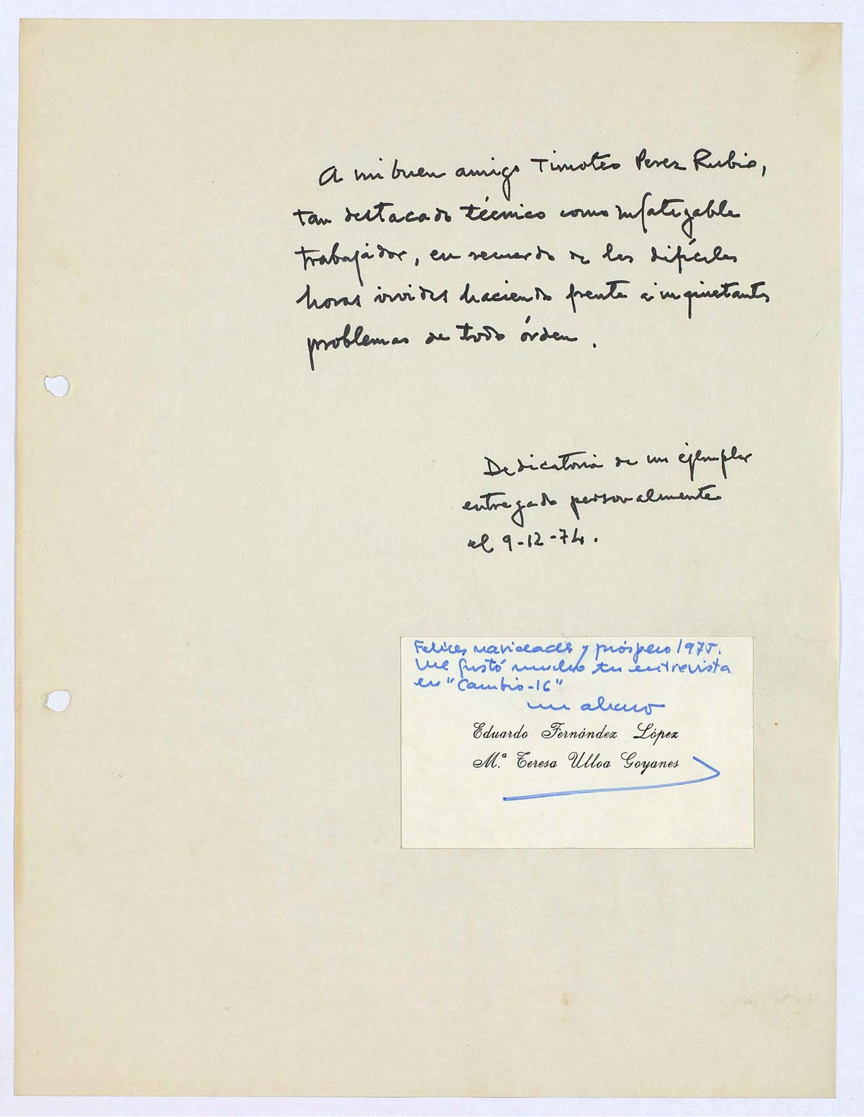 Hoja con la dedicatoria manuscrita que José Lino hizo a Timoteo Pérez Rubio al hacerle entrega de un ejemplar del libro Salvamento y Protección del Tesoro Artístico Español. Pegada en la hoja hay una tarjeta de visita manuscrita de Eduardo Fernández López y Mª Teresa Ulloa Goyanes.