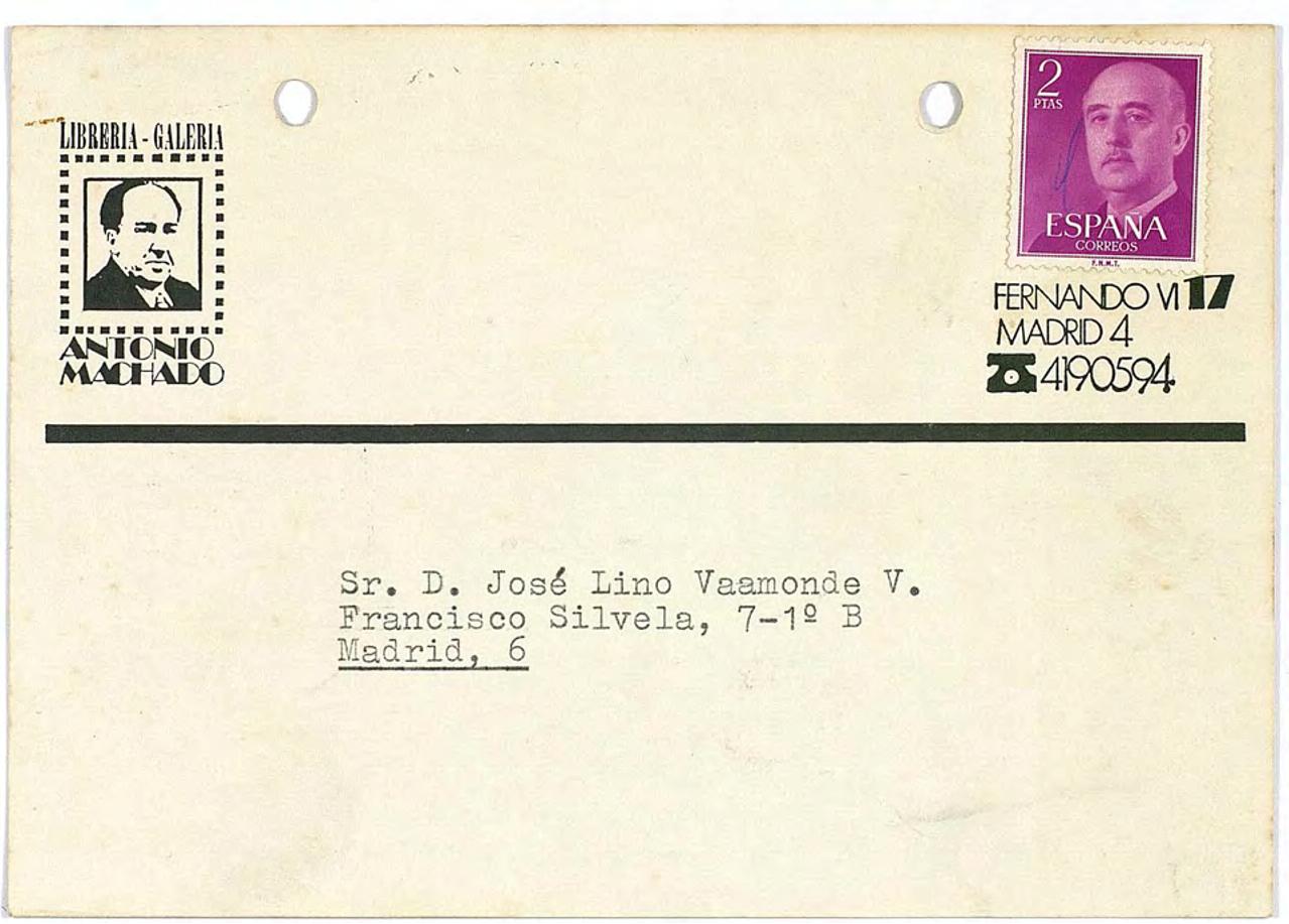 Cartulina postal de la librería Antonio Machado de Madrid dirigida a D. José Lino Vaamonde V.