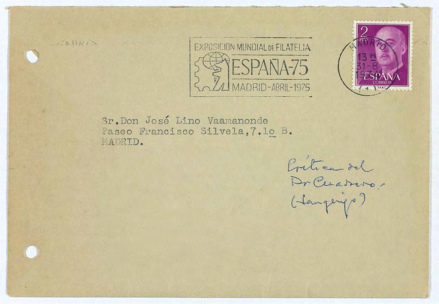 Sobre dirigido a José Lino Vaamonde por el Dr. Luis Cuadrado Colorado, que contiene carta mecanografiada. Junto a esta le adjunta la crítica del libro de Vaamonde Salvamento y Protección del Tesoro Artístico Español durante la Guerra, 1936-1939.