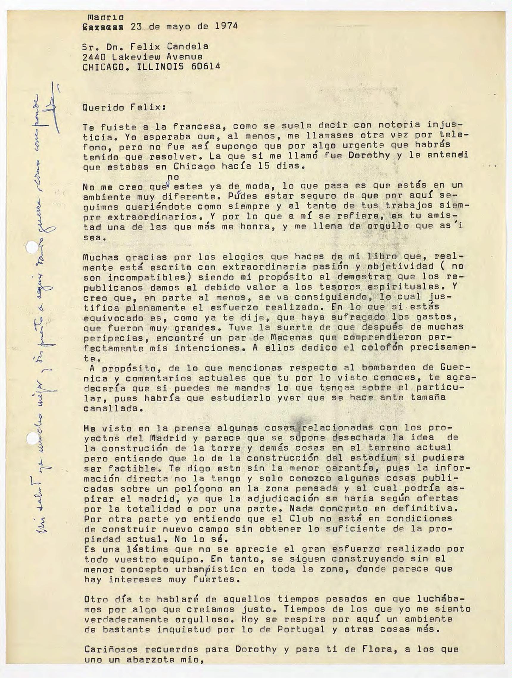 Copia de carta mecanografiada dirigida al Sr. D. Félix Candela (Chicago) por José Lino Vaamonde.