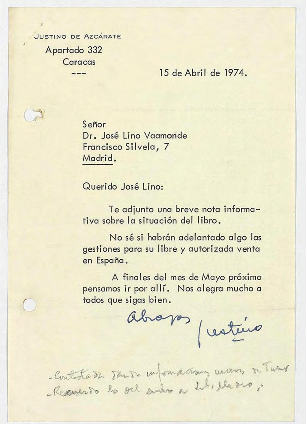 Nota mecanografiada dirigida por Justino de Azcárate a José Lino Vaamonde y sobre por avión con membrete de la Fundación Eugenio Mendoza.