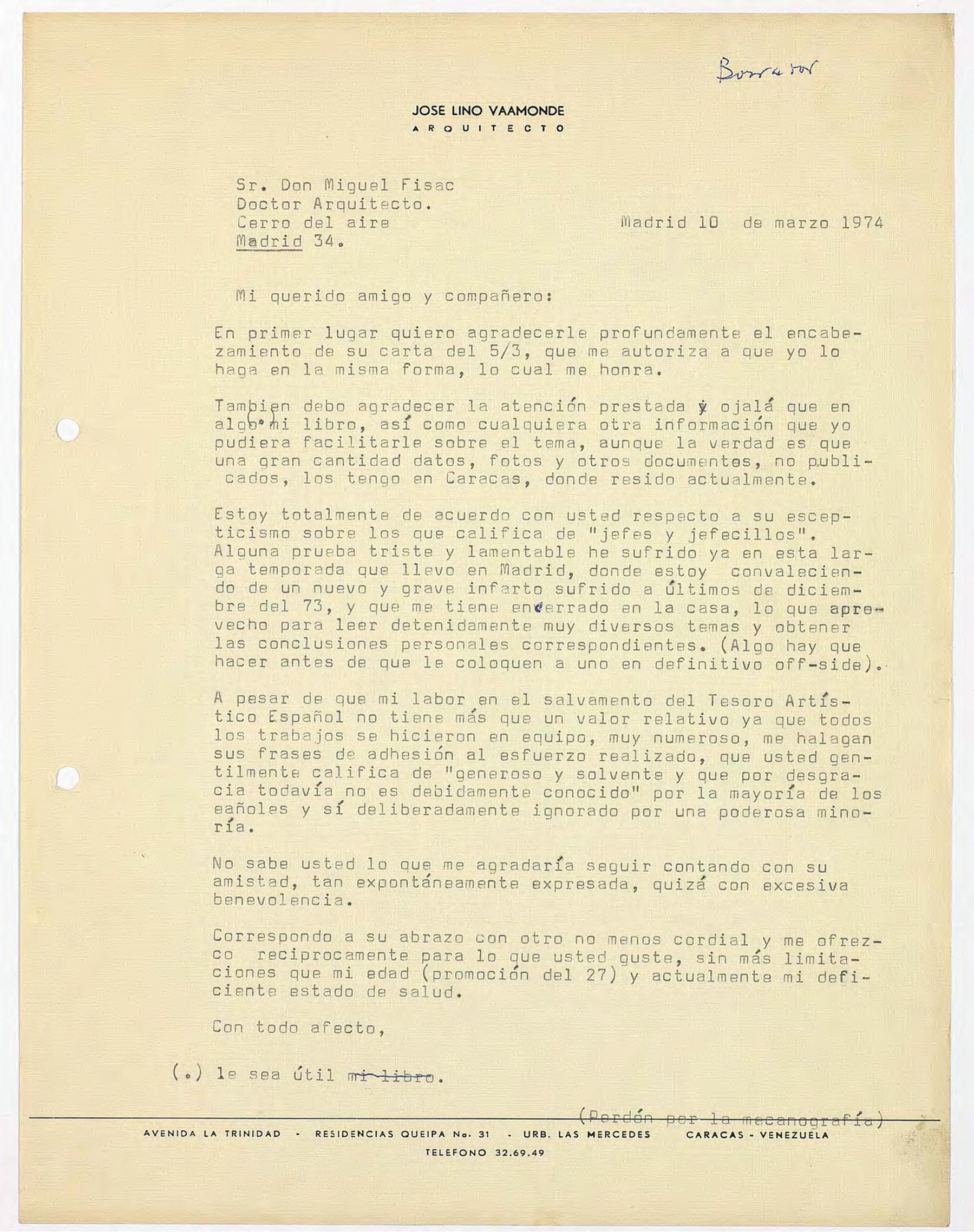 Copia de carta mecanografiada dirigida por José Lino Vaamonde a D. Miguel Fisac Serna. (3 copias)