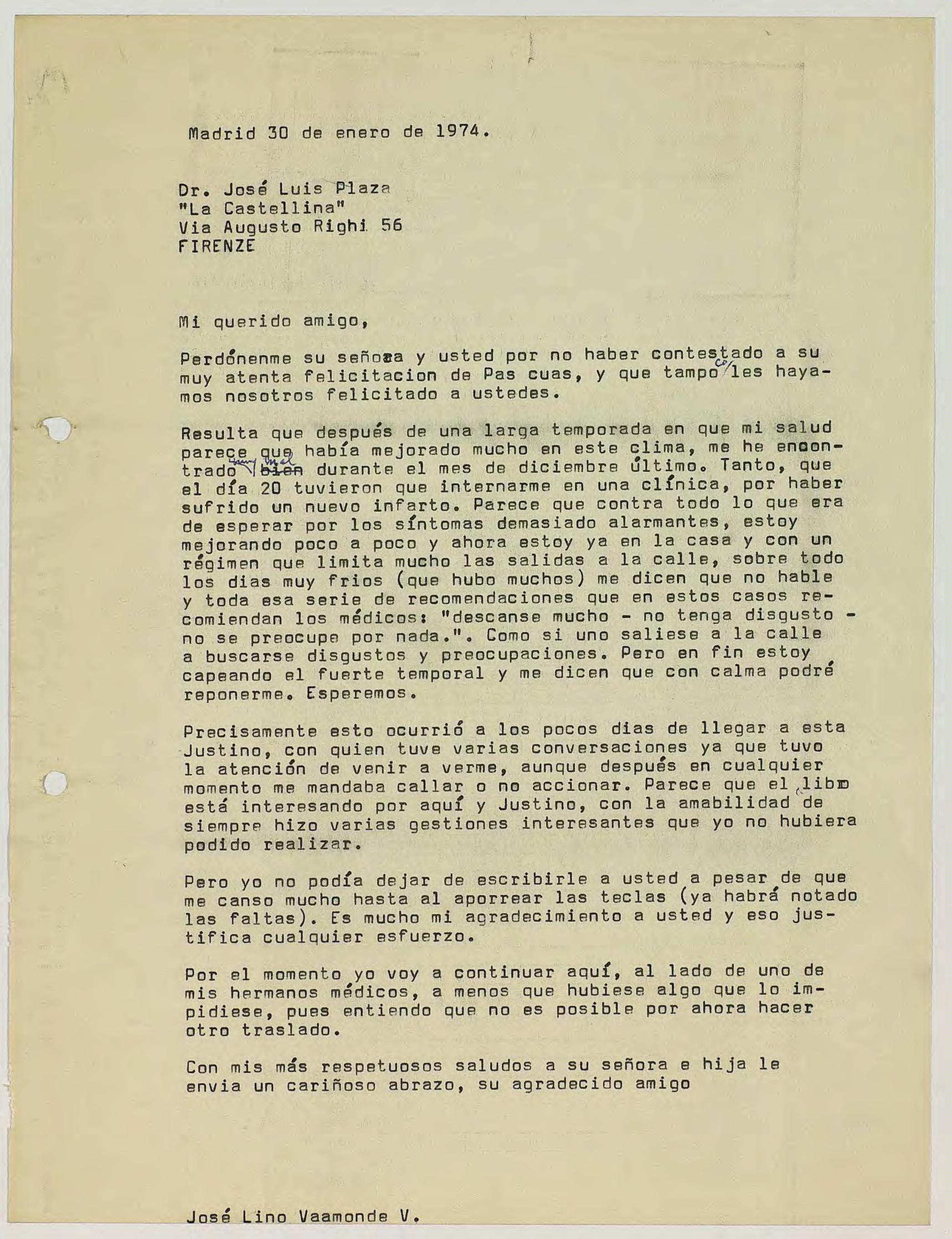 Copia de carta mecanografiada dirigida por José Lino Vaamonde al Dr. José Luis Plaza.