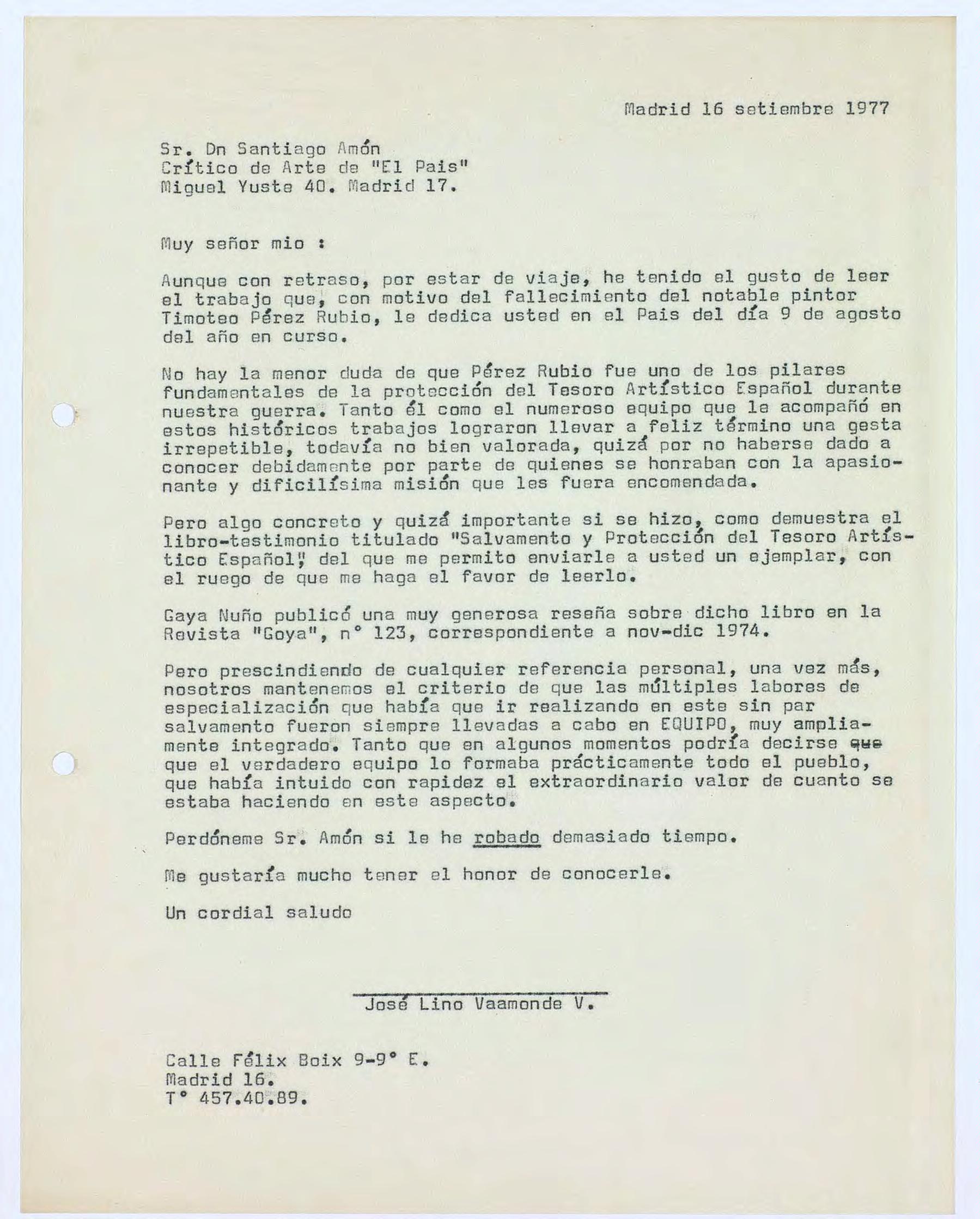 Dos copias en calco de una carta mecanografiada dirigida al Sr. D. Santiago Amón, crítico de Arte de El País, por José Lino Vaamonde V.