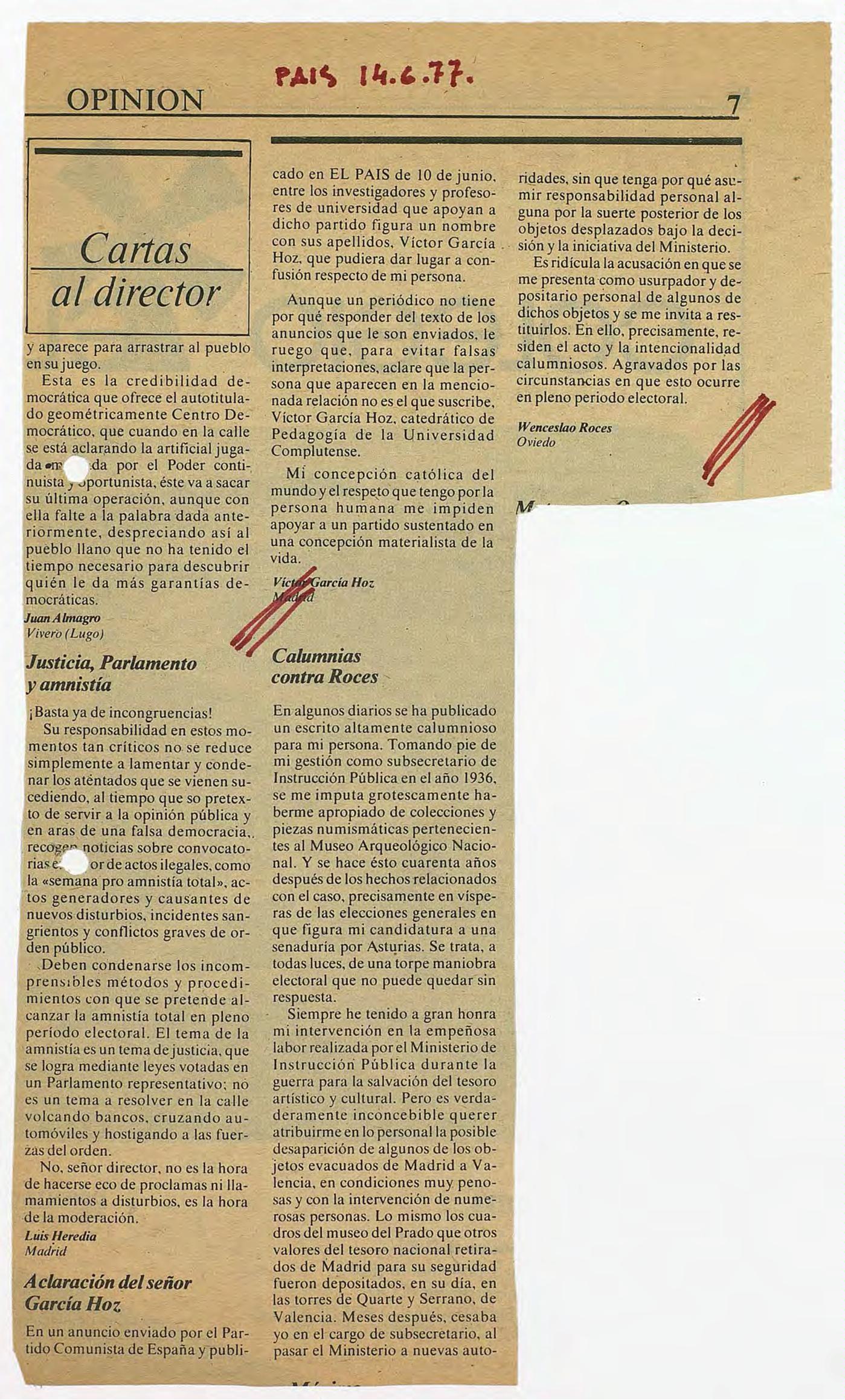 Recorte de Cartas al Director, una en concreto de Wenceslao Roces, publicada en El País.