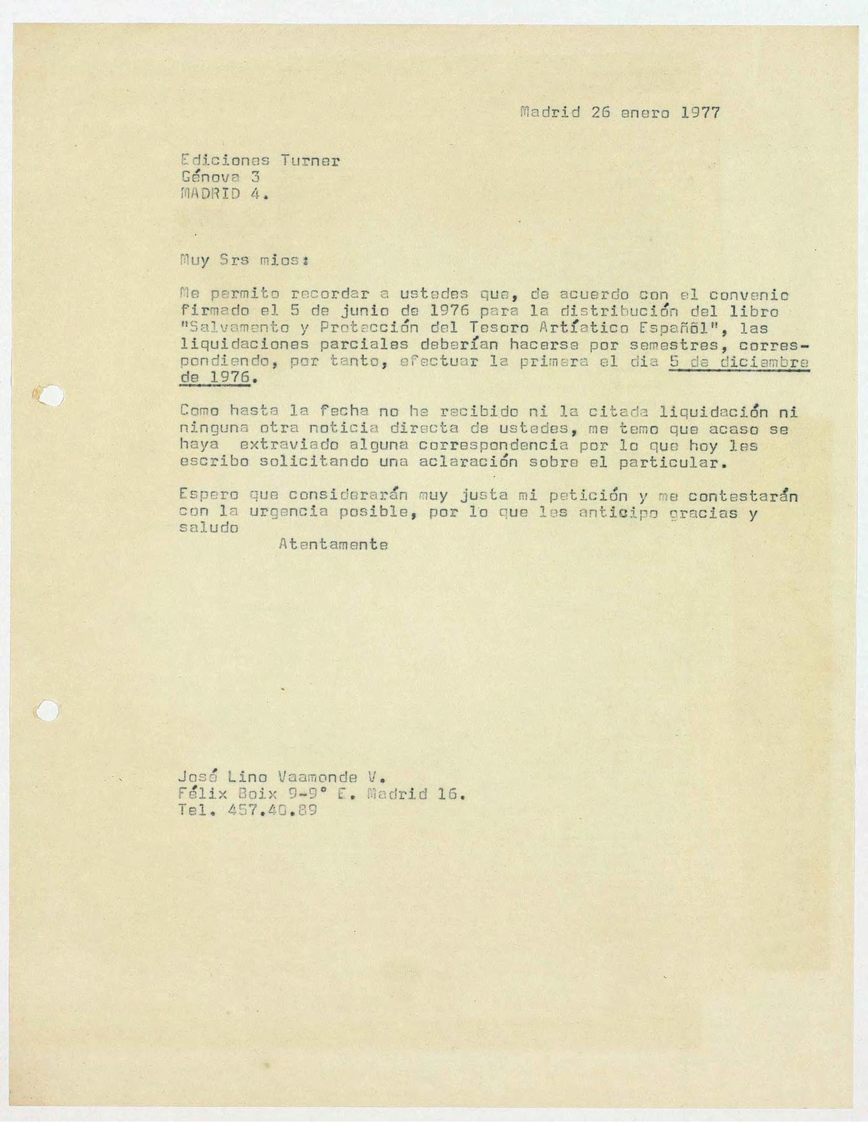 Carta mecanografiada dirigida a Ediciones Turner por José Lino Vaamonde.