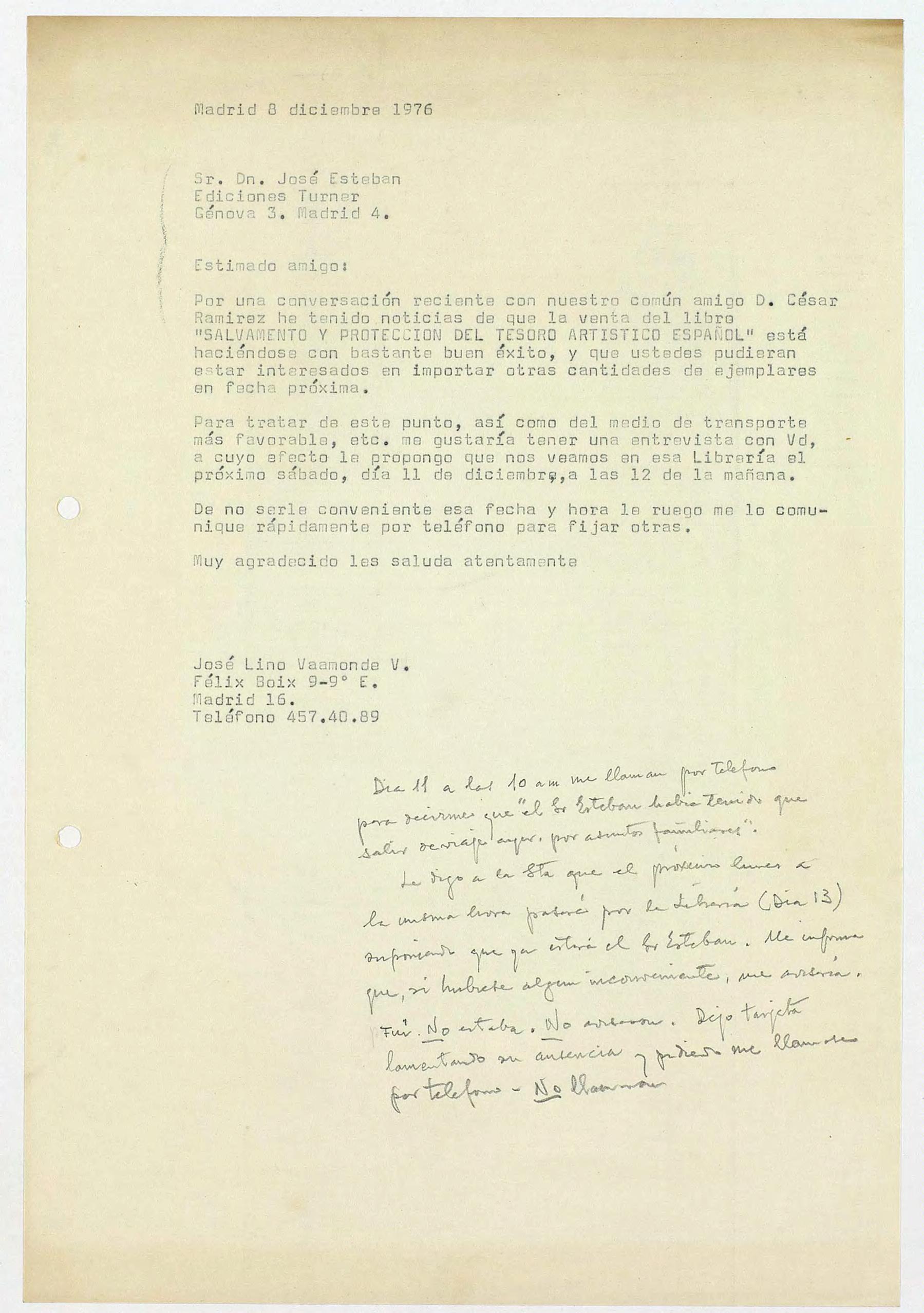 Carta mecanografiada dirigida al Sr. D. José Esteban de Ediciones Turner por José Lino Vaamonde.