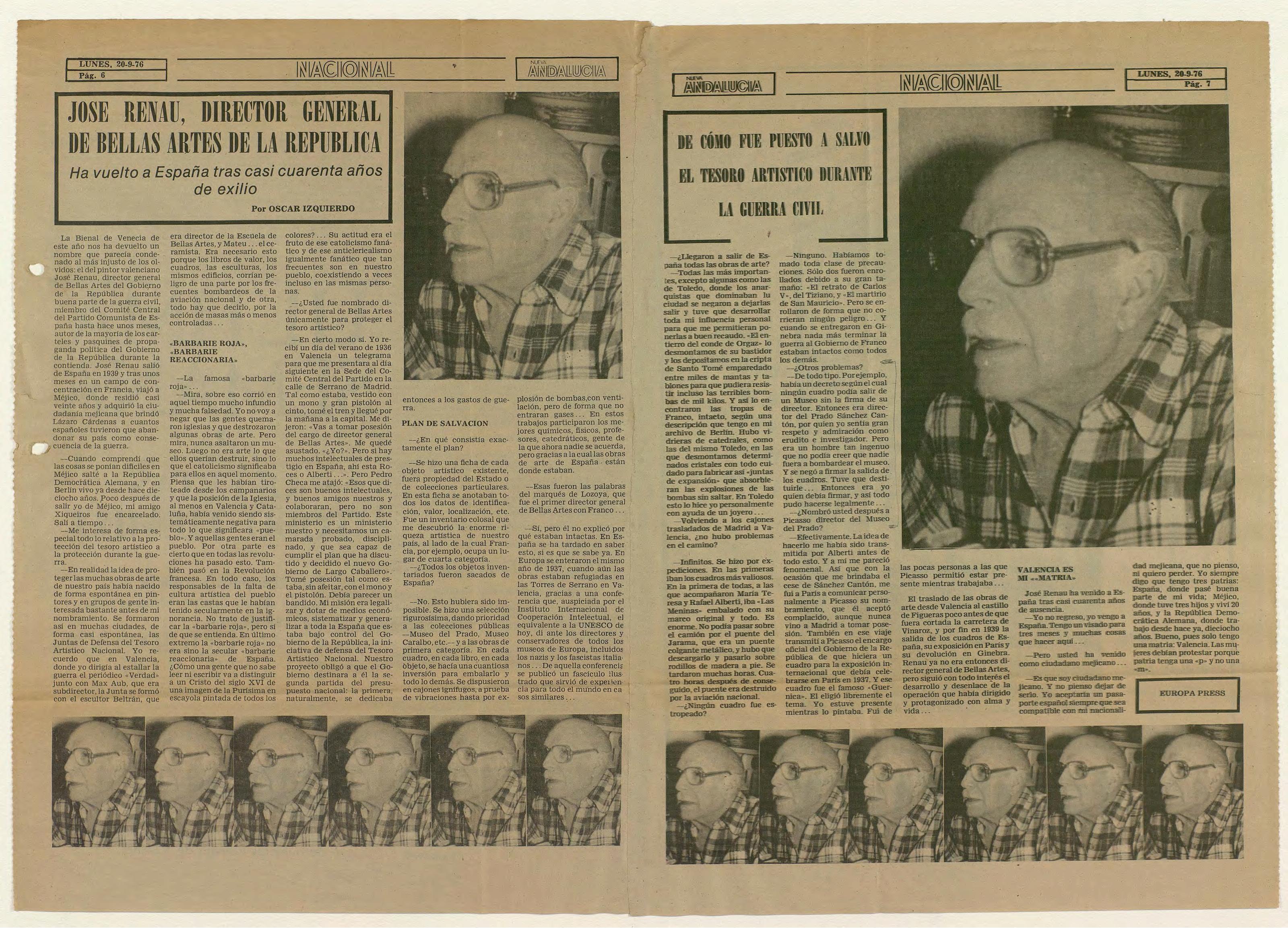 Artículo de Oscar Izquierdo titulado "José Renau, Director General de Bellas Artes de la República ha vuelto a España tras caso cuarenta años de exilio. De cómo fue puesto a salvo el Tesoro Artístico durante la Guerra Civil", publicado en el Diario Nueva Andalucía.