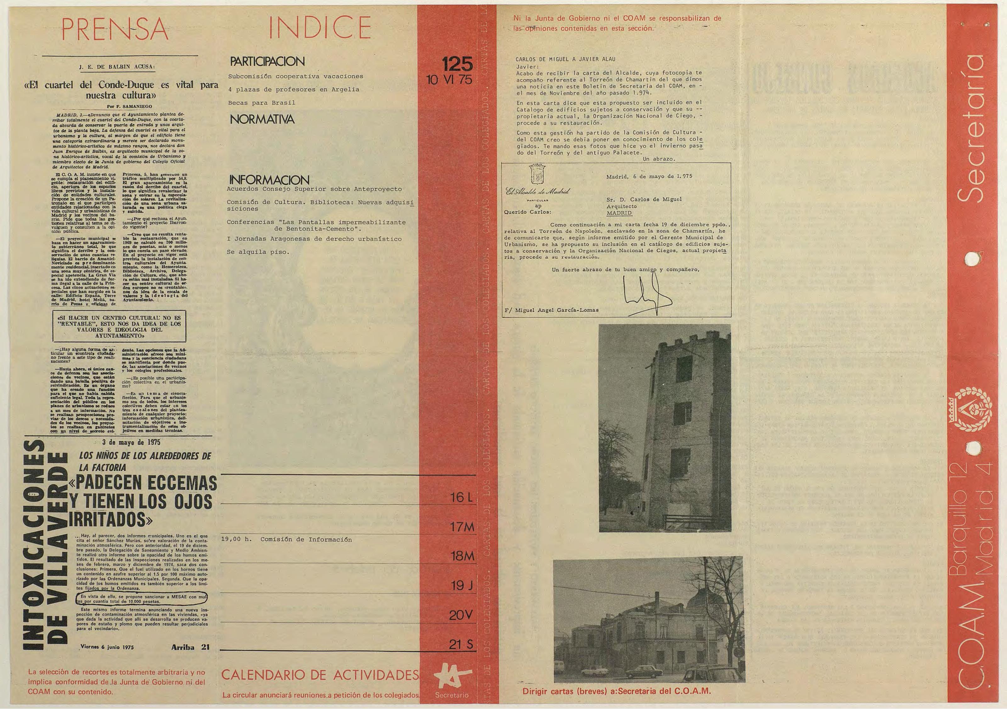 Boletín del C.O.A.M. en el que aparece una reseña "Salvamento y Protección del Tesoro Artístico Español, un impresionante y desconocido testimonio de la guerra civil española: la cuidadosa defensa del patrimonio cultural en la zona republicana. Arquitecto J. L. Vaamonde."