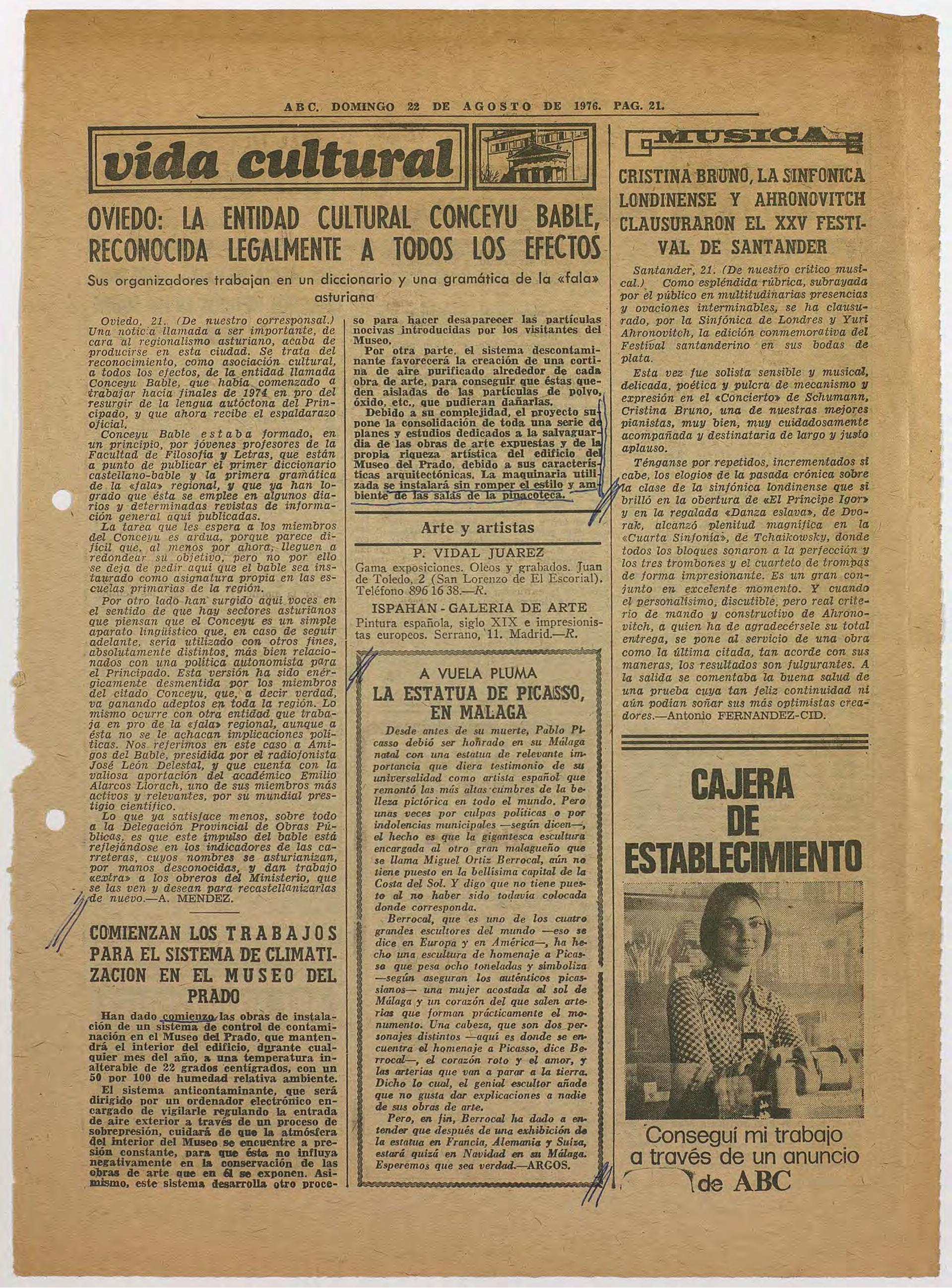Artículos titulados "Comienzan los trabajos para el sistema de climatización en el Museo del Prado" y "La Estatua de Picasso en Málaga", publicados en el Diario ABC.