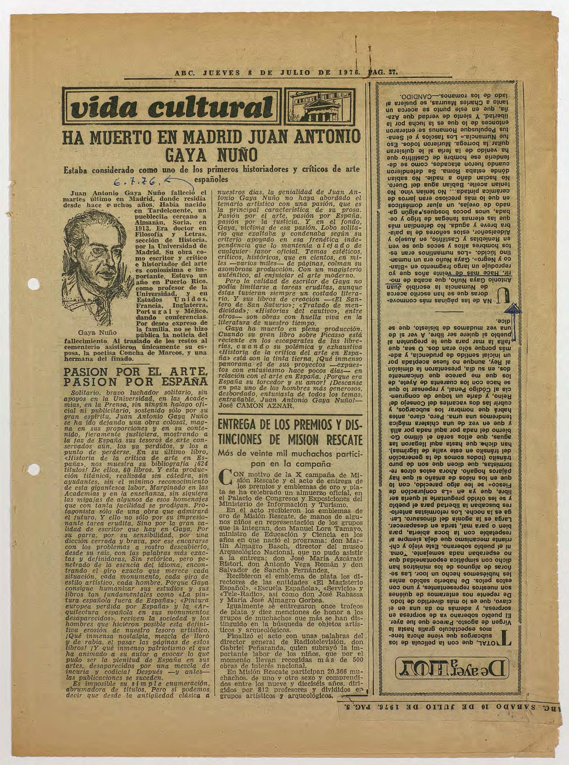 Artículo de José Camón Aznar titulado "Ha muerto en Madrid Juan Antonio Gaya Nuño" / "Pasión por el Arte, pasión por España". Publicada en el Diario ABC. Con recorte pegado del mismo diario la columna De ayer a hoy escrita por CÁNDIDO.